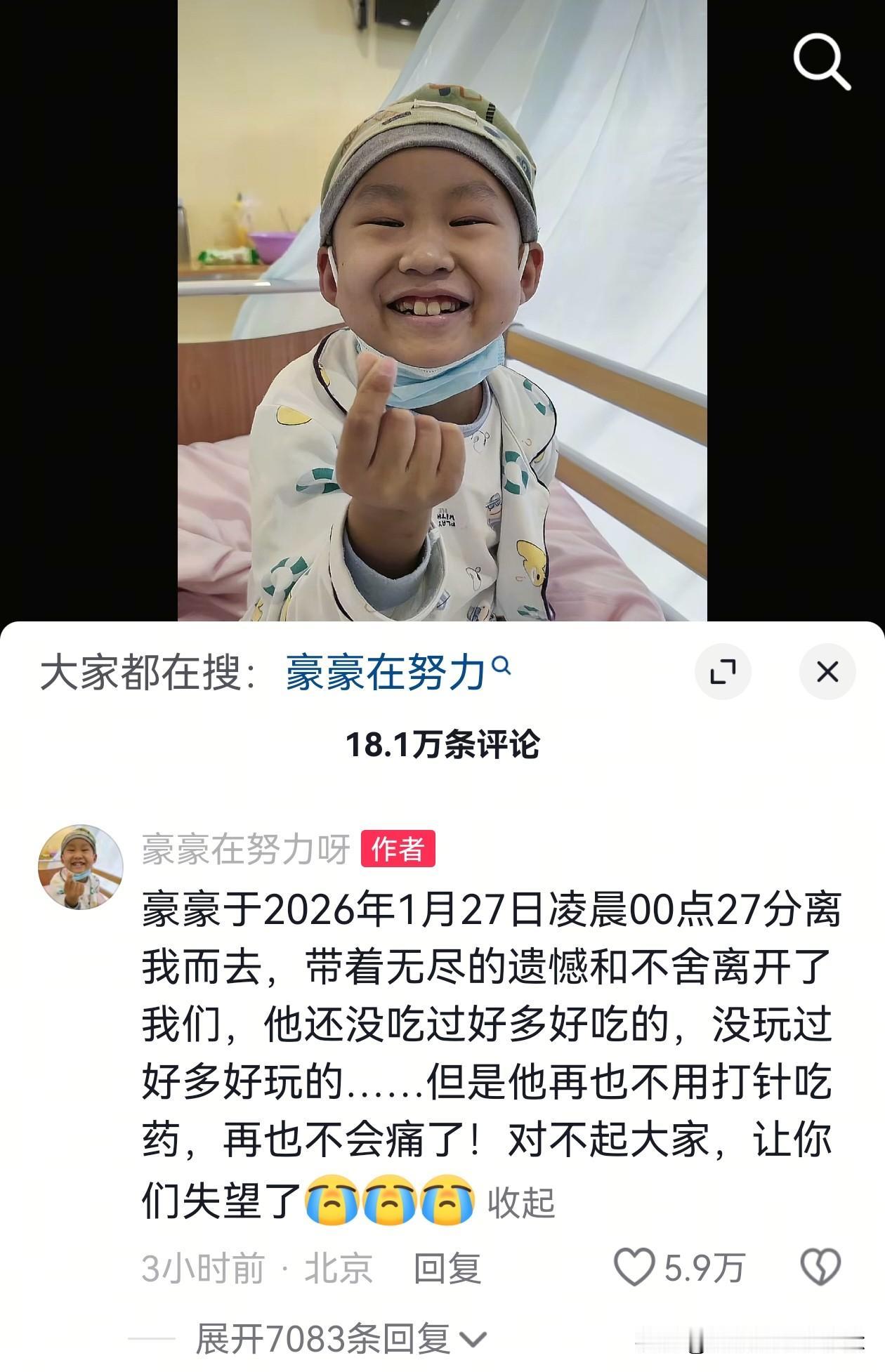 他不会再痛了!曾经那个笑着喊“王子,请恢复健康。”的白血病男孩豪豪,今天凌晨离世了! 大家还记得2023年那个冬天吗?视频里,因抗癌治疗而变得肥胖肿胀的脸,对着镜头,希望网友对他喊:“王子,请恢复健康,永不复发!” 他笑着对镜头比耶,那句话瞬间击中了无数人的心,也让正在勇敢对抗病魔的他,被全国很多人记住,成了大家心里牵挂的“小王子”。 可惜,童话没能照进现实。虽然经历第二次移植后,病情有了短暂的稳定,但是没多久又复发了,而且病情急转直下,他的身体也出现浮肿,视力下降等问题。 2025年年底,他经历了一次抢救,医生一度认为他难撑过元旦,但他靠身体与意志力硬撑到了2026年。 今年1月初,所有药物对他来说已经没啥作用了,已经到了最后的关怀期,家属婉拒了社会捐款,只是想办法能减轻他的痛苦。 到了1月中旬以后,豪豪陷入昏睡,偶尔清醒时会喊“难受”,却依然憧憬出院后去露营、吃烧烤,去吃很多美食,去完成很多还来不及做的事情! 从最初还能对着镜头笑,到后来需要一直躺在病床上;从能清晰地说出那句话,到后期说话都变得费力。他4岁确诊,累计经历了17次化疗、15次放疗、2次骨髓移植。 他的家人用记录着他每一次的坚持,每一次的治疗,我们看着那个小小的身影在努力与病魔抗争。他一直勇敢地战斗,坚持到最后一刻。 小王子,任务完成了。你去到了一个没有病痛、只有快乐的地方了。谢谢你曾带给我们的感动和力量,你用小小的身躯,展现了巨大的勇气,病魔并没有磨灭他眼里的光。 也许我们无法记住每一个细节,但请记住有一个叫豪豪的男孩,他曾那么努力地想好起来,记住他的笑容,记住他的坚强。 天堂没有疼痛,愿你在那里永远健康,快乐奔跑! 白血病患儿豪豪