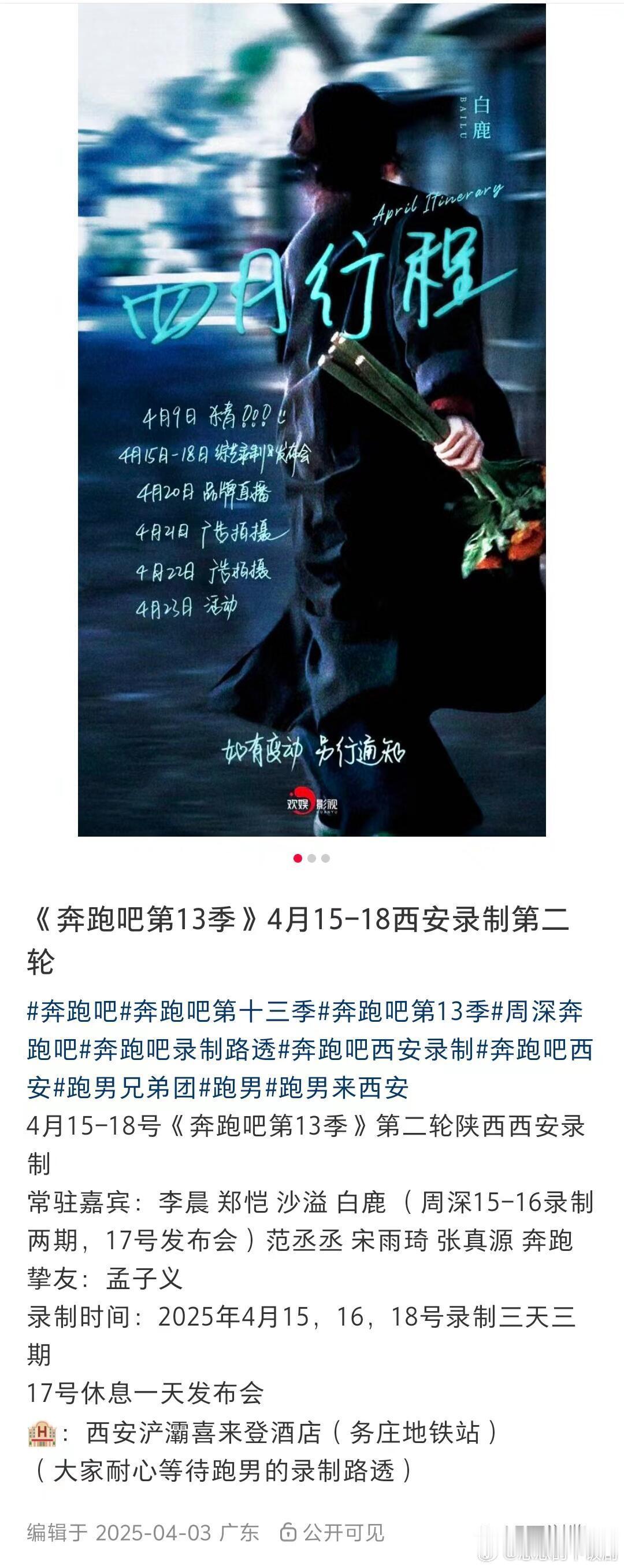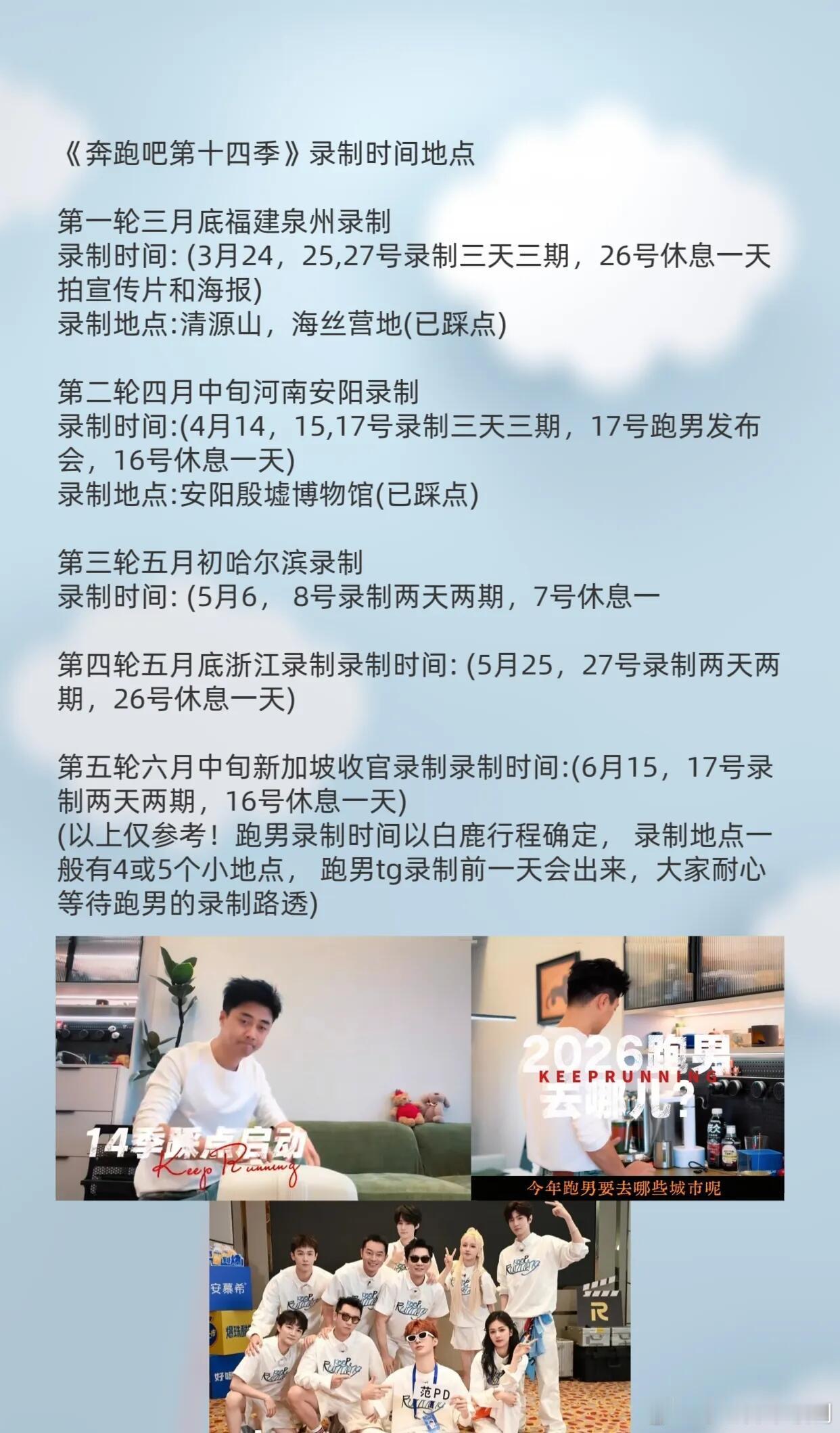 奔跑吧《奔跑吧第十四季》录制时间地点- 播出时间:预计2026年第二季度(4-6月)登陆浙江卫视黄金档录制周期:2026年3月至6月,分多轮进行分轮录制计划(网传路透版)轮次 录制时间录制地点 细节第一轮3月24-27日福建泉州(清源山、海丝营地)录制3天3期,26日休息拍摄宣传片与海报第二轮4月14-17日河南安阳(殷墟博物馆)录制3天3期,17日举办跑男发布会第三轮5月6-8日哈尔滨 录制2天2期第四轮 5月25-27日浙江(具体城市待定)录制2天2期第五轮 6月15-17日新加坡 收官录制2天2期嘉宾阵容(网传版)常驻嘉宾:李晨、郑恺、沙溢、白鹿、范丞丞、宋雨琦、张真源(周深因档期冲突可能退出常驻)飞行嘉宾:孟子义、李昀锐、翟子路、代露娃、魏大勋、邓恩熙、唐九洲等拟邀嘉宾:蔡文静、时代少年团、敖瑞鹏、丁禹兮、李雪琴、王鹤棣等奔跑吧‖