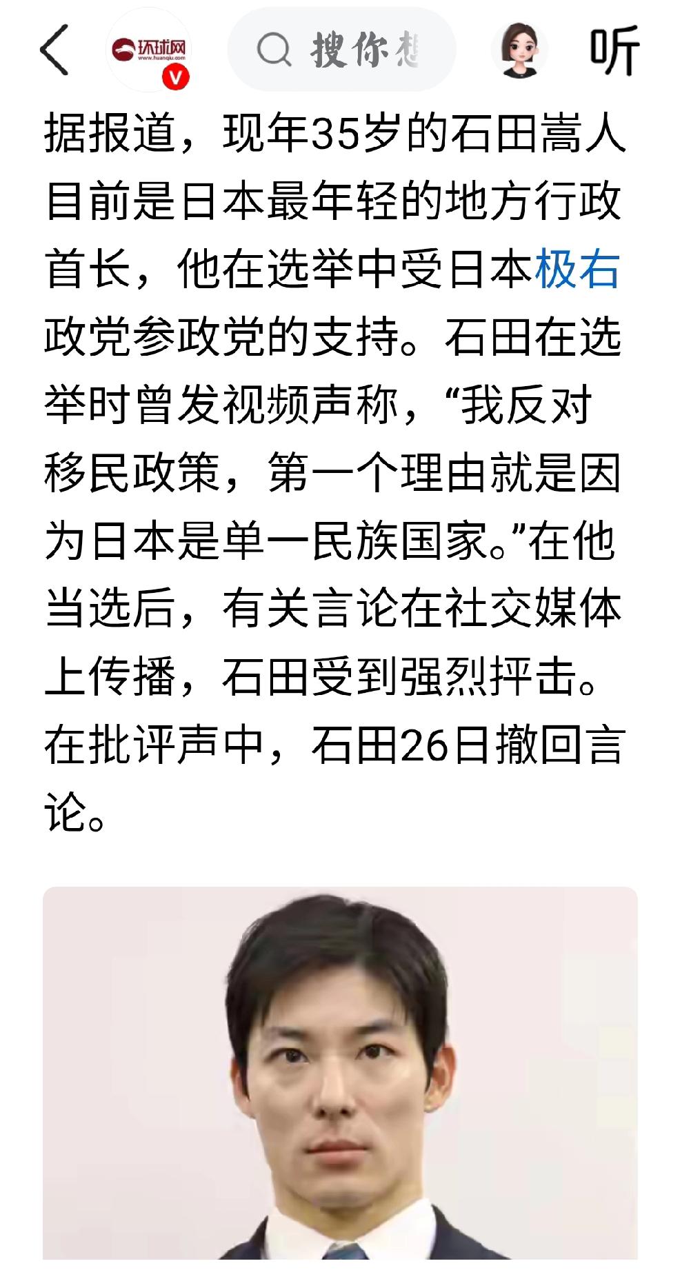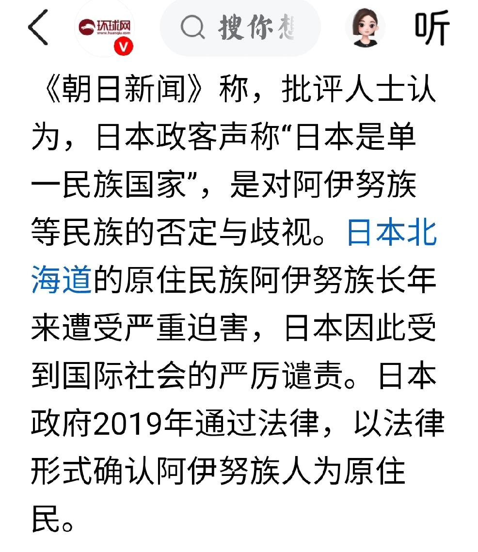阿依努族,琉球民族 根据环球网,日本朝日新闻1月27日报道,1月25日当选福井县知事的石田嵩人,发视频“宣称日本是单一民族国家”。 个人认为:日本北海道的原住民族阿伊努族,长期受到严重迫害,人权问题被日本政府故意-掩盖,人为故意造成歧视忽视。而琉球民族则被联合国承认,是琉球群岛的原住民,琉球民族的主权和人权问题受到长期的人为故意的歧视与压迫。日本外务省一贯否认存在琉球人,不承认曾存在主权国家琉球王国。 然而,当选的福井县知事石田,则是坦白承认,这些事实,可是却受到了日本当局的压力,不得不撤回自己所说的事实。 可见,日本的社会是多么的压抑和不自由,就连由民选的行政长官,都不得不撤回自己所说的事实。