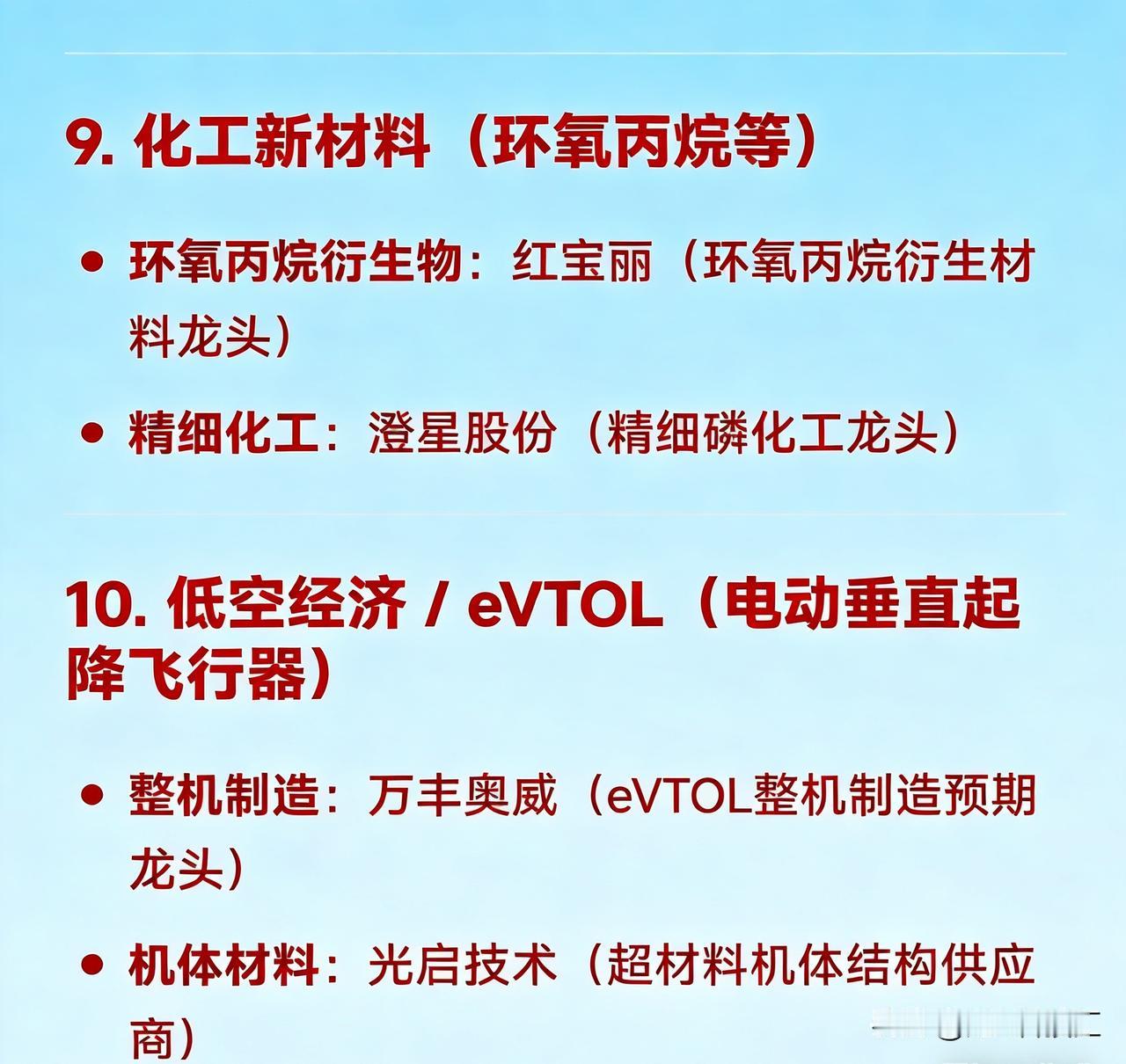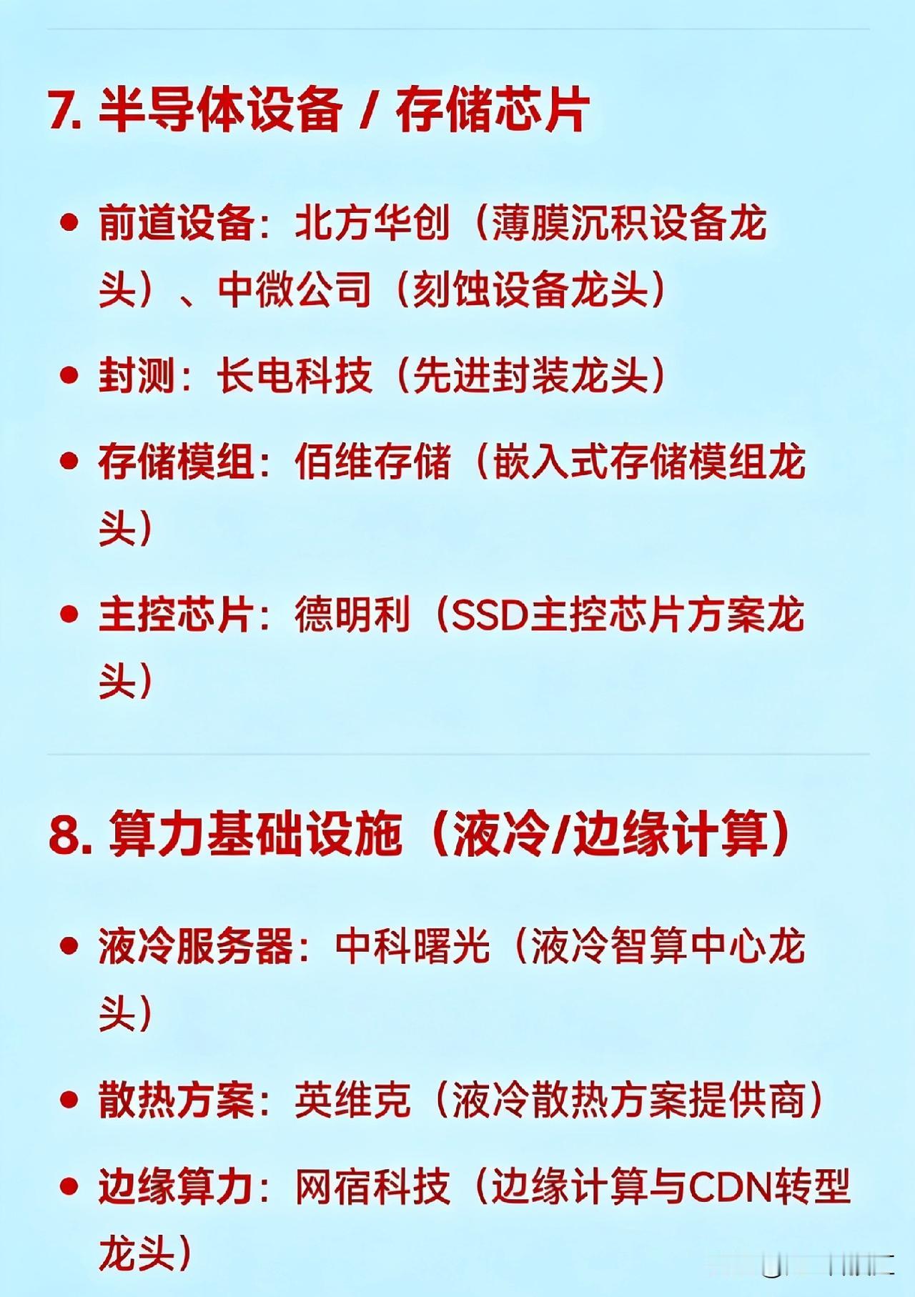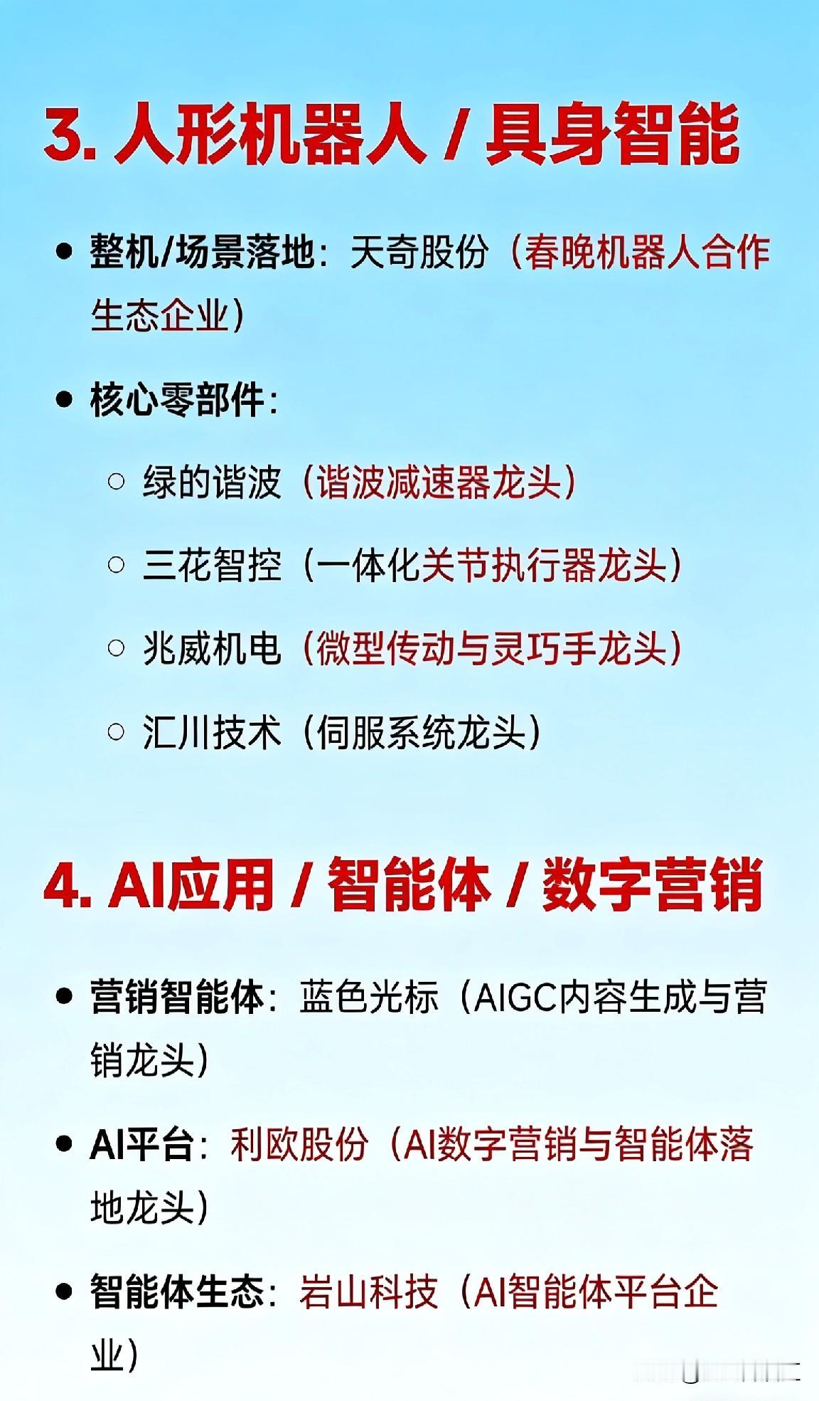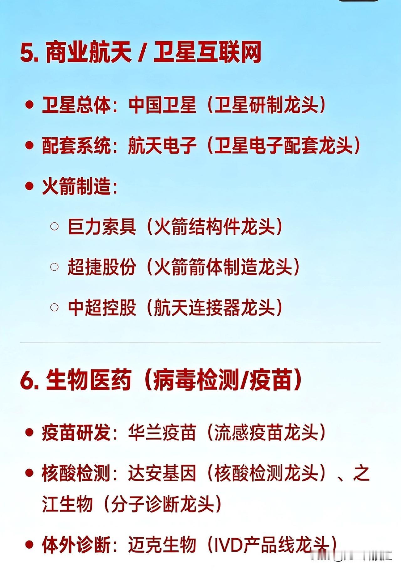 2026年1月27日十大热点科技及其产业链核心龙头 1. 贵金属(黄金/白银) 上游资源开采:山东黄金(黄金采掘龙头)、盛达资源(金银矿龙头) 冶炼加工:白银有色(白银冶炼综合龙头)、紫金矿业(全球黄金资源龙头) 伴生金属:湖南白银(伴生银资源企业) 2. 钙钛矿电池 / 新型光伏 技术路线:东方日升(钙钛矿+HJT叠层技术龙头) 组件制造:拓日新能(钙钛矿电池研发代表)、协鑫集成(钙钛矿组件一体化龙头) 高效电池:隆基绿能(BC电池与组件全球龙头) 3. 人形机器人 / 具身智能 整机/场景落地:天奇股份(春晚机器人合作生态企业) 核心零部件: 绿的谐波(谐波减速器龙头) 三花智控(一体化关节执行器龙头) 兆威机电(微型传动与灵巧手龙头) 汇川技术(伺服系统龙头) 4. AI应用 / 智能体 / 数字营销 营销智能体:蓝色光标(AIGC内容生成与营销龙头) AI平台:利欧股份(AI数字营销与智能体落地龙头) 智能体生态:岩山科技(AI智能体平台企业) 5. 商业航天 / 卫星互联网 卫星总体:中国卫星(卫星研制龙头) 配套系统:航天电子(卫星电子配套龙头) 火箭制造: 巨力索具(火箭结构件龙头) 超捷股份(火箭箭体制造龙头) 中超控股(航天连接器龙头) 6. 生物医药(病毒检测/疫苗) 疫苗研发:华兰疫苗(流感疫苗龙头) 核酸检测:达安基因(核酸检测龙头)、之江生物(分子诊断龙头) 体外诊断:迈克生物(IVD产品线龙头) 7. 半导体设备 / 存储芯片 前道设备:北方华创(薄膜沉积设备龙头)、中微公司(刻蚀设备龙头) 封测:长电科技(先进封装龙头) 存储模组:佰维存储(嵌入式存储模组龙头) 主控芯片:德明利(SSD主控芯片方案龙头) 8. 算力基础设施(液冷/边缘计算) 液冷服务器:中科曙光(液冷智算中心龙头) 散热方案:英维克(液冷散热方案提供商) 边缘算力:网宿科技(边缘计算与CDN转型龙头) 9. 化工新材料(环氧丙烷等) 环氧丙烷衍生物:红宝丽(环氧丙烷衍生材料龙头) 精细化工:澄星股份(精细磷化工龙头) 10. 低空经济 / eVTOL(电动垂直起降飞行器) 整机制造:万丰奥威(eVTOL整机制造预期龙头) 机体材料:光启技术(超材料机体结构供应商)