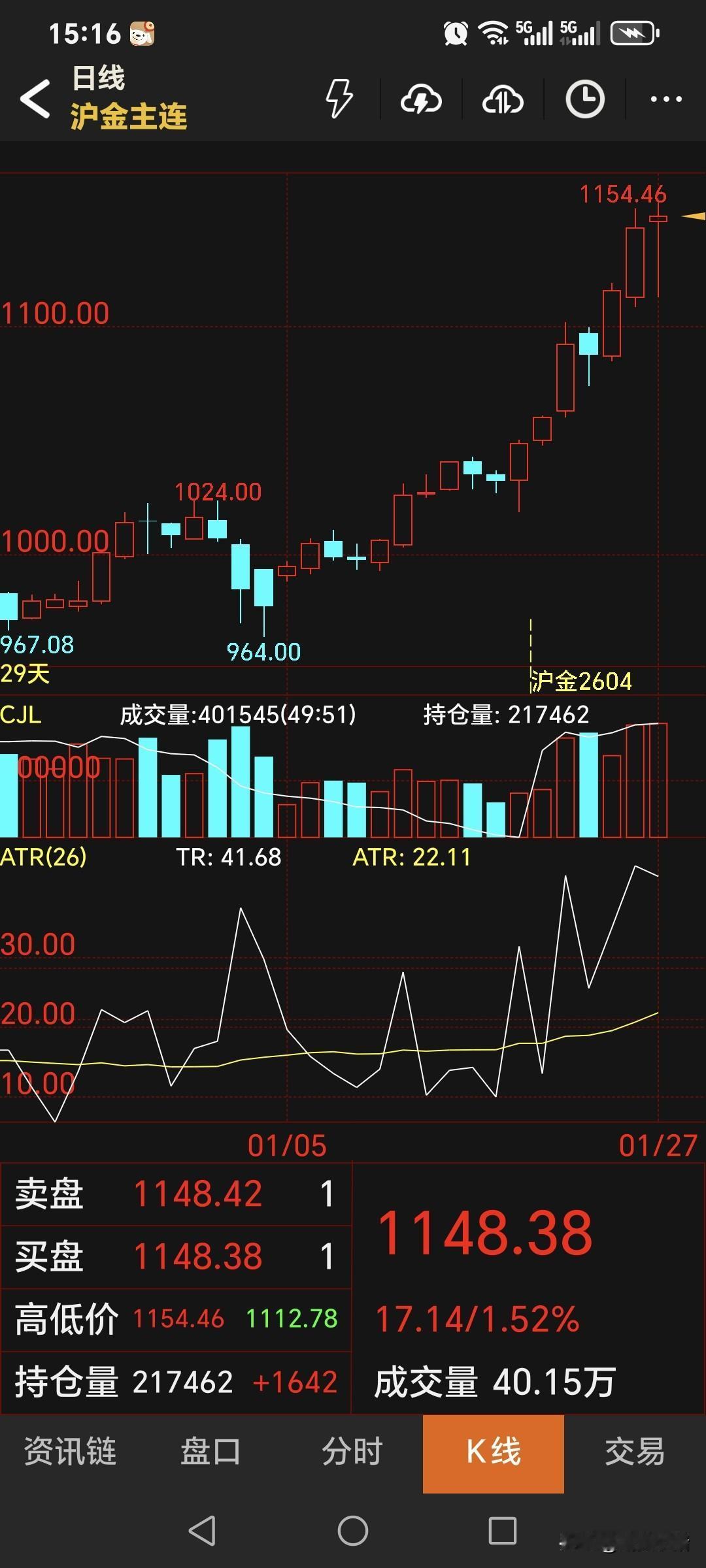 星期二, 国内黄金期货主力合约 收盘于1148.38元, 比昨日的高了5.06元; 结算价为1445.24元, 比周一的提高了14元。 当日的开盘价, 继续低于收盘价, 从盘面看,仍收于 一根阴线很长的红色上涨阳线!