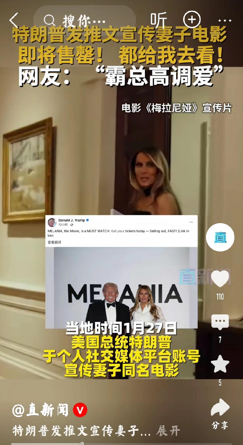 直新闻,1月27日报道,美国总统特朗普发推文,宣传妻子同名电影。 个人认为:一个字,真是绝。 果然是商人出身的美国总统,恐怕大多数美国人都深陷债务紧张当中,唯有以特朗普为首的一小部分人当,享受赚取巨额财富的快乐。 特朗普为什么不让大多数美国民众享受赚钱的快乐呢? 特朗普家族现在流行拍电影了吗?难道没有重点关注虚拟币了吗?