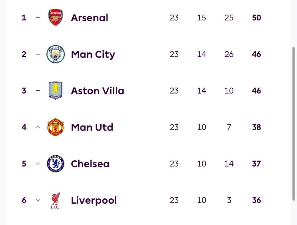 英超积分榜前六球队相互交锋能力排名: 1、阿斯顿维拉队,6战积12分 2、曼联,7战积12分 3、曼城,6战积8分 4、利物浦,6战积7分 5、阿森纳,8战积9分 6、切尔西,5战积5分 如果单从这个榜单看来,阿森纳即便夺得了26赛季英超冠军,也是做不到让球迷们心服口服的,除非在后面还剩的两场对决中全胜big6对手! 可如果本赛季阿森纳这个冠军最后又被曼城或者阿斯顿维拉偷了去,阿尔特塔还有脸待在兵工厂吗?