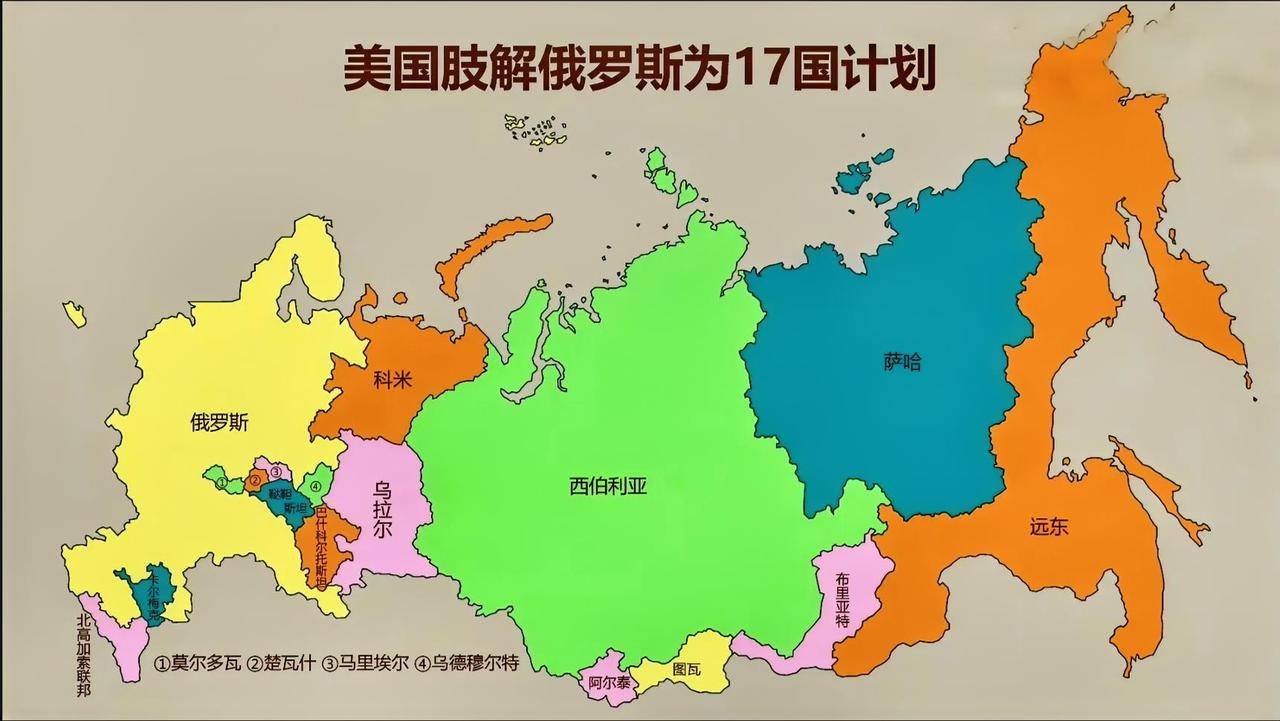这是美国最希望的俄罗斯版图,也就是美国心心念念的所谓“肢解俄罗斯17国计划”,将俄罗斯进一步肢解为17个国家。分别是 俄罗斯 北高加索联邦 卡尔梅克 鞑靼斯坦 巴什科尔托斯坦 楚瓦什 莫尔多瓦 马里埃尔 乌得穆尔特 科米 乌拉尔 西伯利亚 阿尔泰 图瓦 布里亚特 萨哈 远东。 分裂后出现的国家肯定有矛盾尖锐、领土争端等问题,这就会成为美国的代理人战场,引发比现在更广泛的地区冲突。 这种权力真空和不稳定就会被美国利用,以扩大影响力来牵制我们,我们当然是不会允许出现这种局面的。