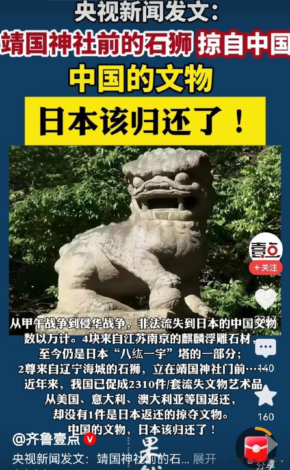 中方态度已经挑明了, 日本掠夺中国的文物,必须要归还了。 这可不是普通的警告,这可是正式的外交照会,可以说容不得半点马虎。 大家可以想一想,被千夫所指的靖国神社,门口蹲着的两个石狮子,竟然是当年日本掠走中国寺庙的文物,可以说,这就是向中国人民的伤口上撒盐。 这一段伤痛每一个人都不会忘记,日本曾经所做的累累罪行,也不会就这样轻易抹去,如今面对强大的战胜国还在故意挑衅,可以说现在正是日本还债的好时候。