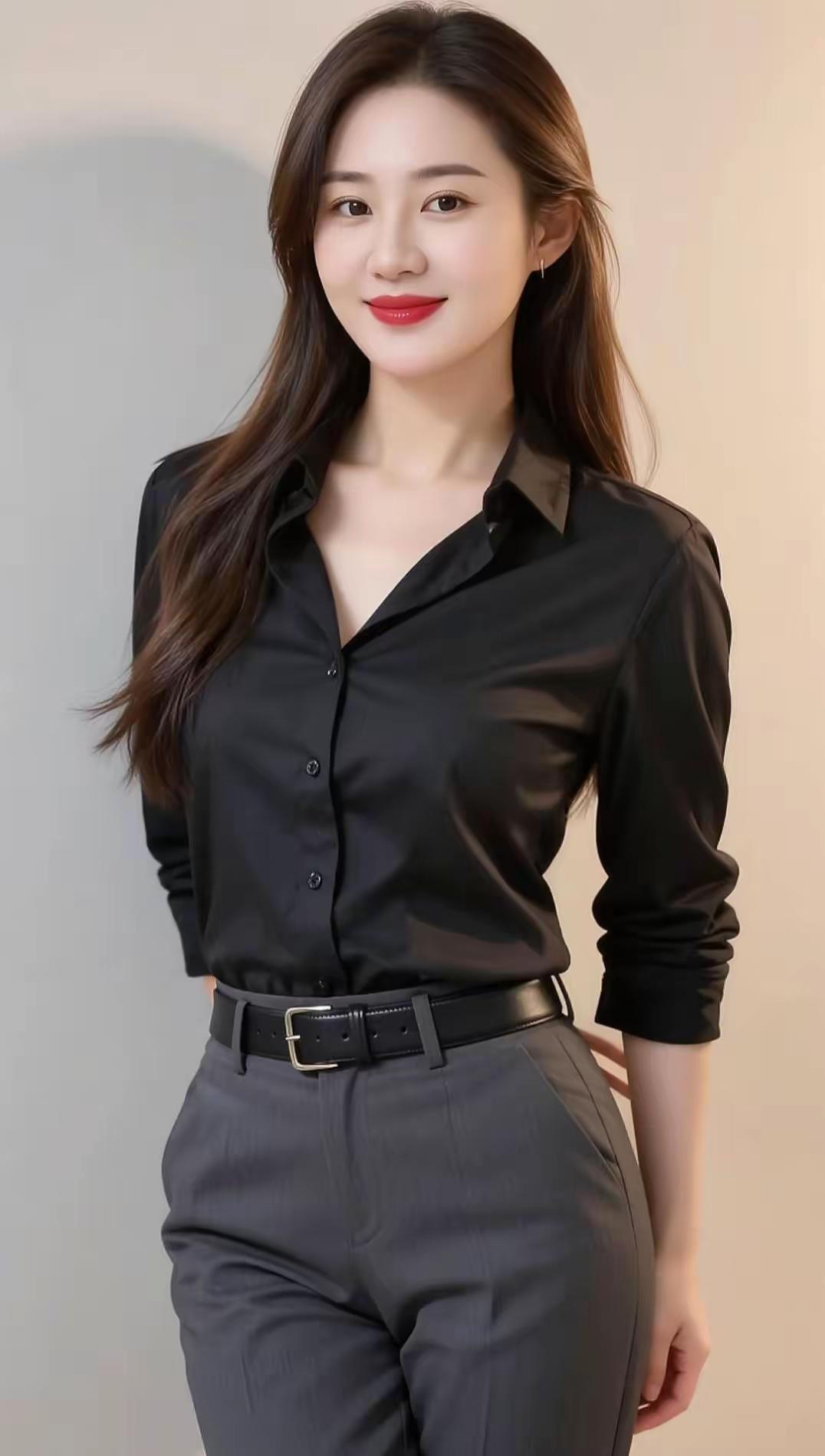 优雅职场风,黑色衬衫+灰色西裤,自信满满!职场装如何更显瘦更干练?