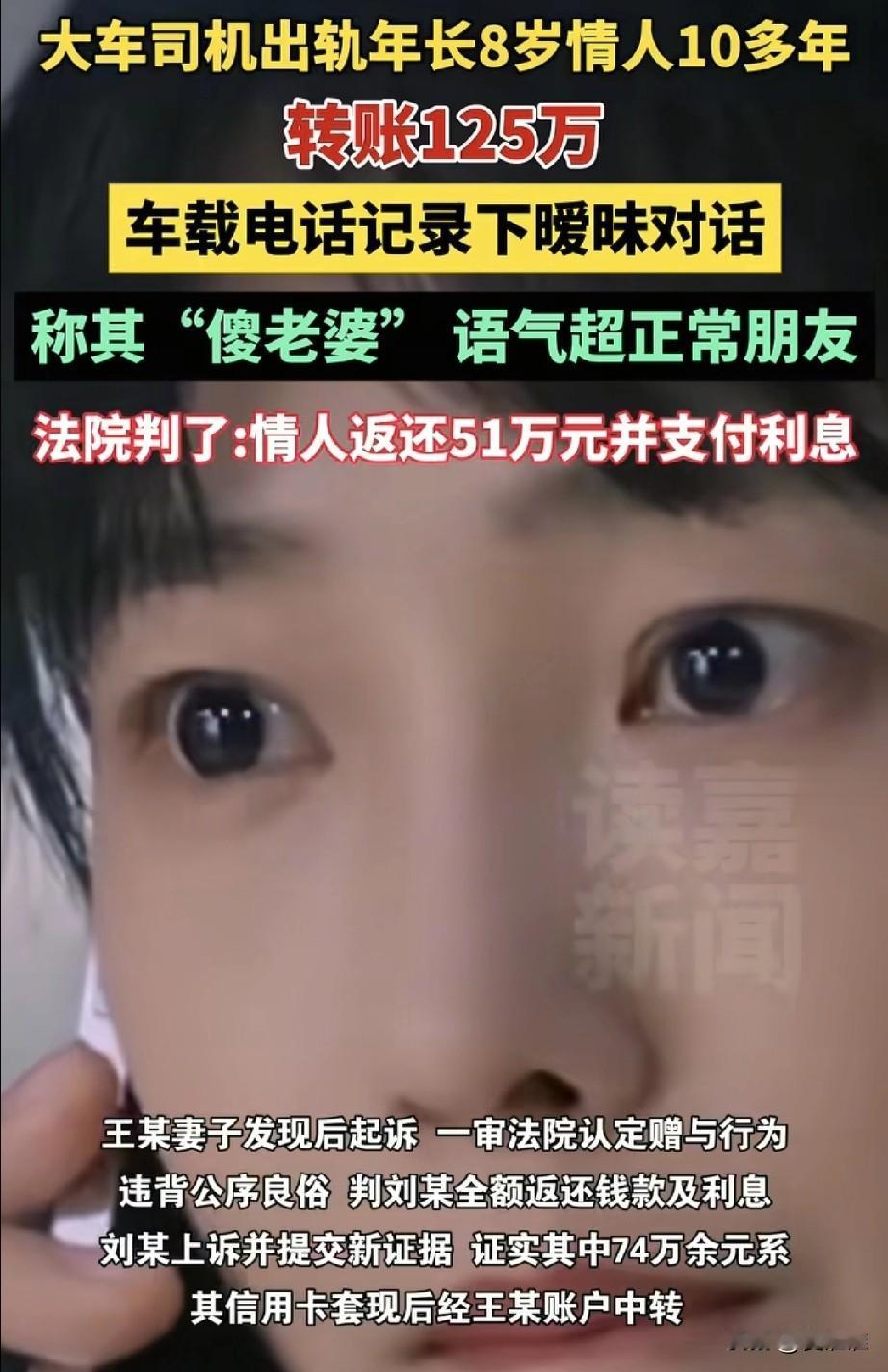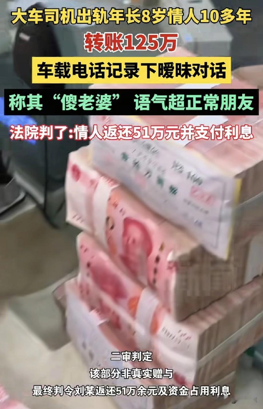 内蒙古一名大车司机王某,与比自己大8岁的刘某保持了十多年的婚外情,期间,王某给刘某转账总计125万元,其中不少钱是在“520”、情人节等特殊日子转的,寓意明显,两人在车载电话中的对话也被录下,王某直接称呼刘某“老婆”“傻老婆”,语气亲密。 王某妻子发现后,将刘某告上法庭。法院认定,王某转给刘某的51万多元属于夫妻共同财产,其赠与行为违背公序良俗,无效,最终判决刘某需将这51万余元返还给王某妻子,并支付利息。其余款项因来自刘某自己卡内,未予支持。