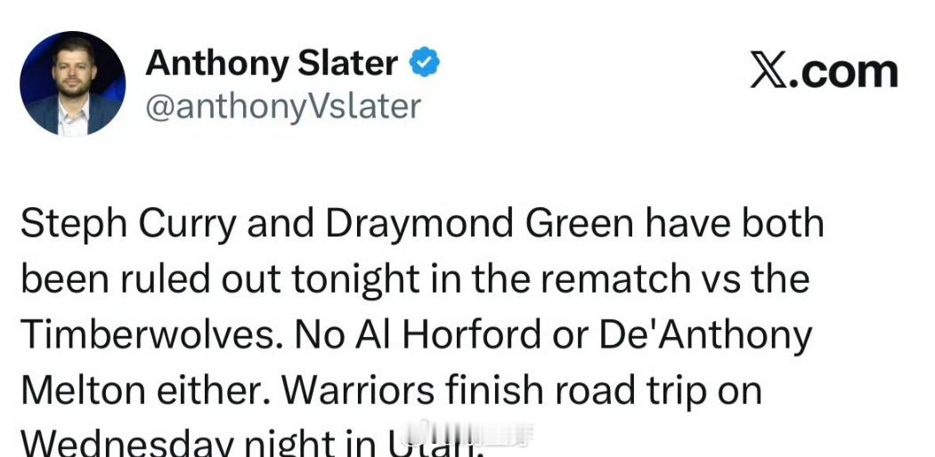 NBA 既然不打,那大家就都不要打了!!!勇士今天背靠背客场挑战森林狼队,昨天两队刚刚完成交锋,勇士大胜对手,这次换了个场地森林狼会有所改变吗?昨天森林狼超多的失误也是他们输掉比赛的一个主要原因。本场比赛,勇士方面库里不打了,然后格林也选择休战,霍福德、梅尔顿也都将缺阵这场对决。这是不给面子啊,就算赢了勇士森林狼也是面对的残阵勇士,没有说服力。昨天华子还在赛场对库里喊话,今天是不是再好好交流一下。