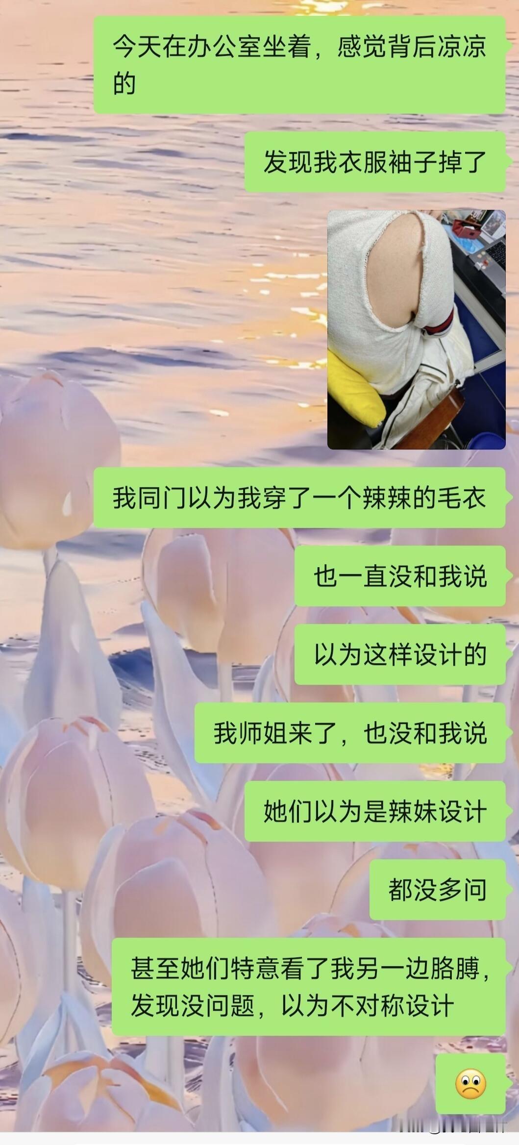 研究生迟钝的反应力 今天中午在实验室感觉背后总钻风,一模,发现自己毛衣的袖子掉了半个。惊呼之下,惹来同门。 同门说,以为今天这个毛衣是我的辣妹穿搭,甚至绕道另一边没烂的地方也看了看,发现没有漏肩膀,心想不对称设计。 师姐也上来了,也并没有觉得有什么不对劲,只觉得辣妹穿搭。