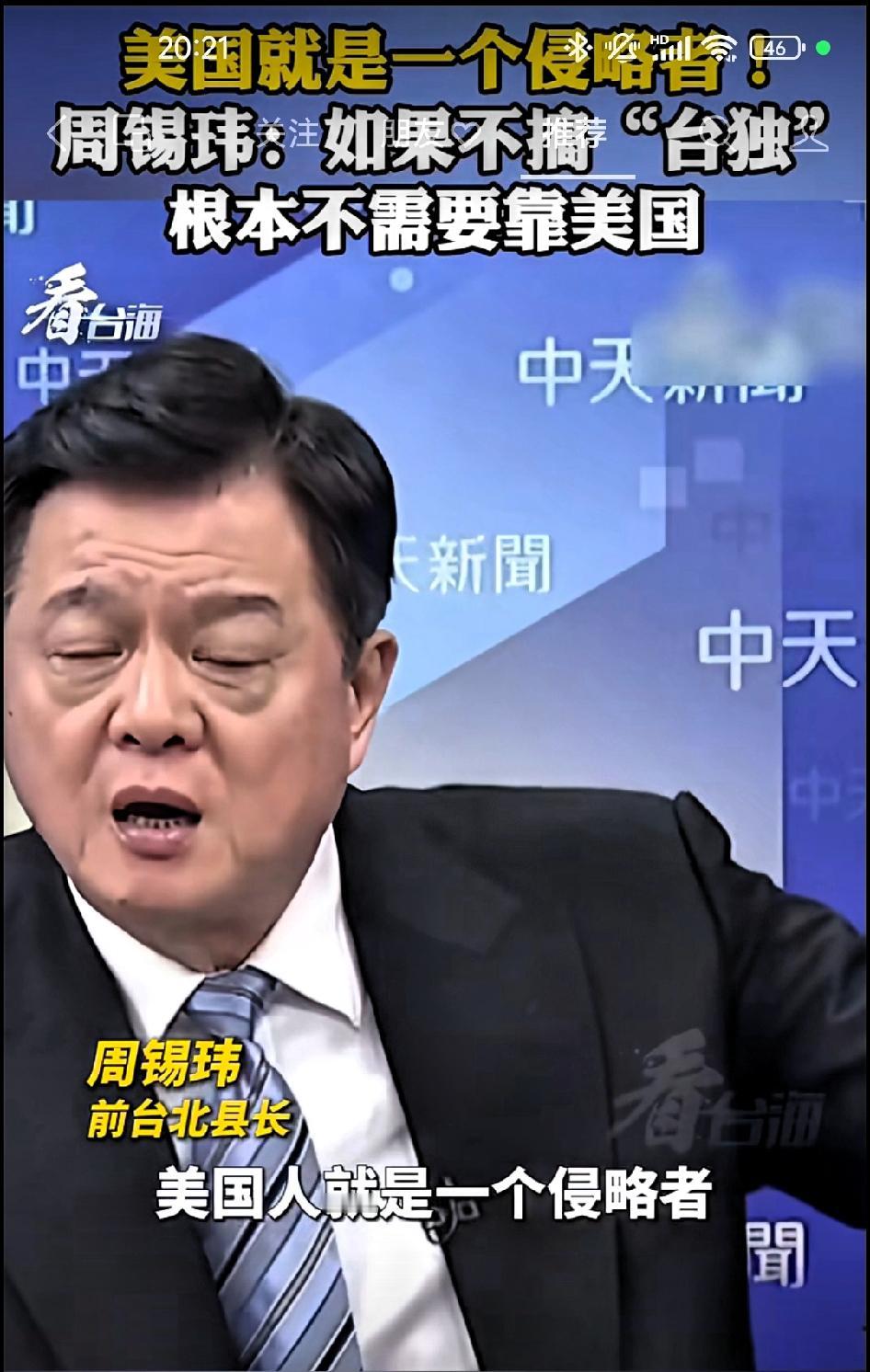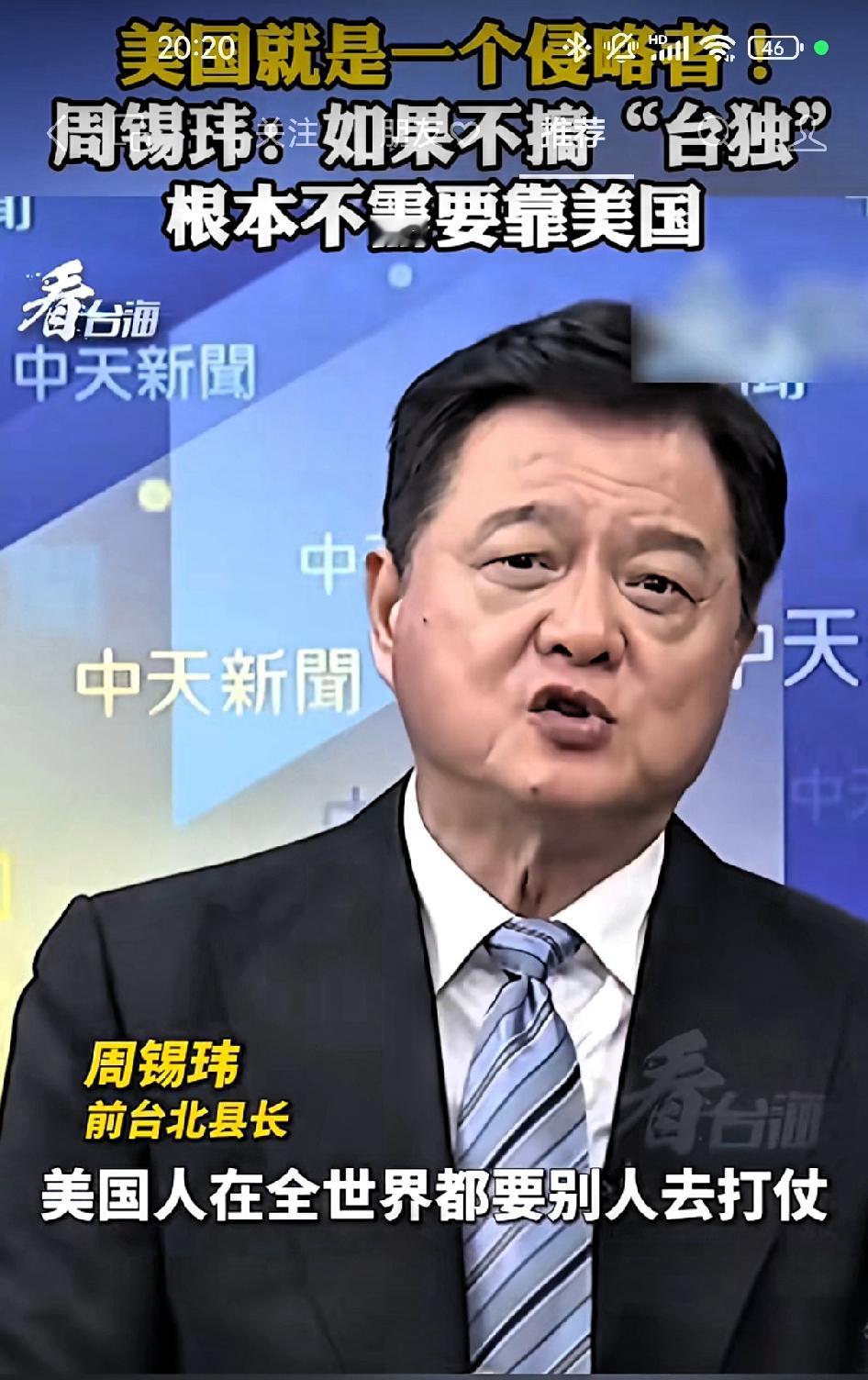 周锡玮:如果不搞“台独”,根本不需要靠美国,美国就是入侵者! 美国人在全世界打仗,叫全世界的人去打仗,美国人就是一个入侵者。现在台湾人仔细想想看,我们只要不跟大陆去挑衅,不搞台独,我们需不需要靠美国?我们不需要。战场上不管谁跟谁打,都会有伤亡,亲者痛仇者快,受伤害的都是中国人。 编者按:美国和台湾,一直是利用和被利用的关系,从解放战争拉拢抵御苏联,到后来卖武器攫取利润,到现在制衡中国大陆的发展,从没有改变!