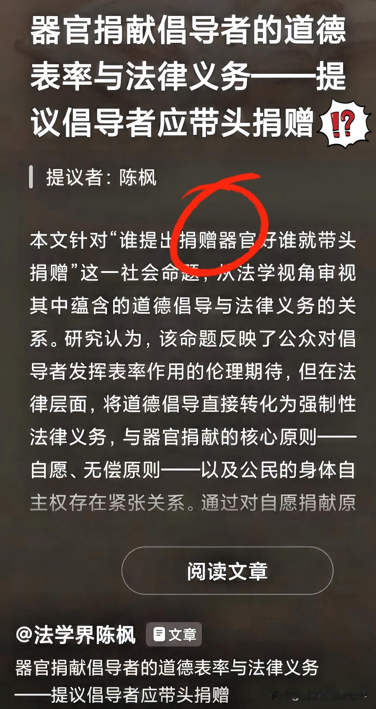 法学界那个叫陈枫的,这回算是把天窗给捅破了! 直接喊话那帮专家:觉得器官移植好,你们带头捐,谁提议谁先上! 这话听着是糙,也不咋客气,但怎么就那么顺耳呢?这不就是咱老百姓心里的这点憋屈吗。 现在的专家,动不动就出来指点江山,好像不开个“药方”就显不出他们能耐。可一动真格的,涉及到自己那点利益或者身板了,跑得比兔子还快。 大家伙烦的真不是捐献这事本身,而是烦那种“拿我当耗材,拿你自己当看客”的嘴脸。 你要真想推广,别光整那些高大上的词儿,先把自己名字签上去,把家里人动员起来。你自己都不敢干的事,凭啥忽悠我们要大度?