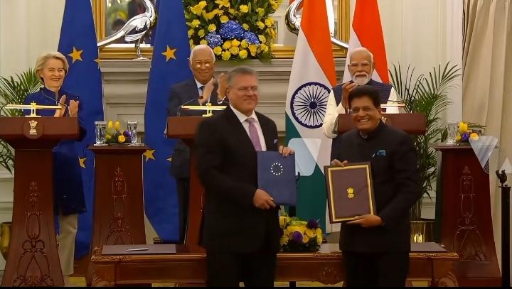 2026年1月27日的欧盟-印度峰会双方签署自由贸易协议的现场。除了协议之外,卡拉斯和苏杰生在上签署了安全与防务伙伴关系协议,这项防务协议标志着欧盟-印度从纯经济向安全战略合作的显著升级,协议涵盖海上安全、网络安全、反恐合作、情报共享、联合军演及防务产业合作,并计划成立防务产业论坛推动军贸与技术协同。 欧盟称此举为“游戏改变者”,旨在推进“战略自主”,减少对美依赖,拓展印太存在;印度则借此实现防务伙伴多元化,提升全球战略地位。 两盘菜在餐桌上惺惺相惜,真有缘分,按照两方以前的尿性,一个有钱,一个会忽悠,这还不是天造地设的一对?一对猴精的到底是付不了钱呢,还是交不出货呢,我真的忍不住狂笑,看欧洲什么时候灰头土脸的开记者会,表明自己错信了印度阿三,都是能源、武器需求国,谁也解决不了谁的问题,纯属自嗨。