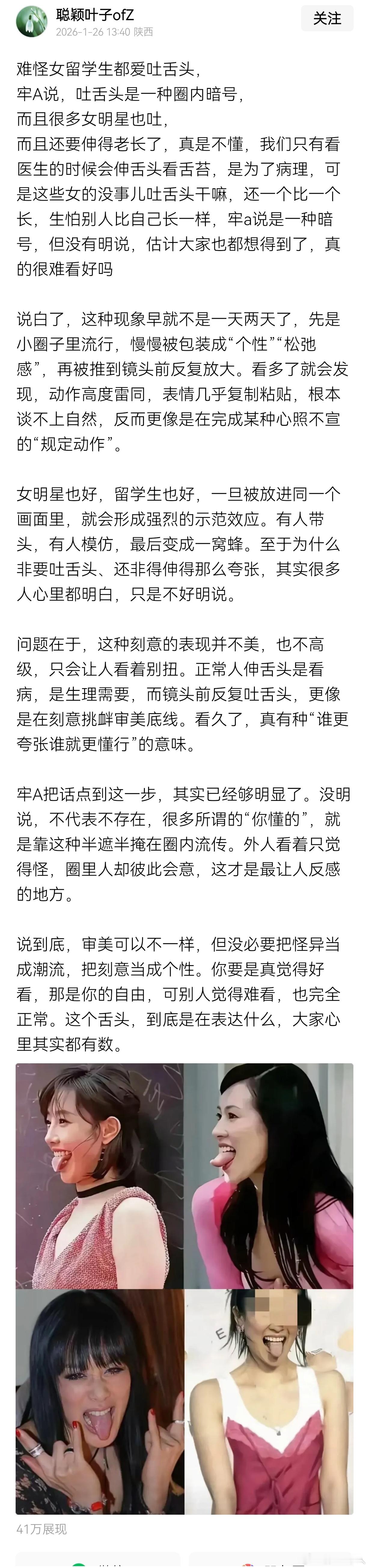 牢A说,吐舌头是一种圈内暗号,而且很多女明星也吐,而且还要伸得老长了,真是不懂。我们只有看医生的时候会伸舌头看舌苔,是为了病理,可是这些女的没事儿吐舌头干嘛,还一个比一个长,生怕别人比自己长一样,牢a说是一种暗号,但没有明说,估计大家也都想得到了,真的很难看好吗?吐舌头确实莫名其妙的。
