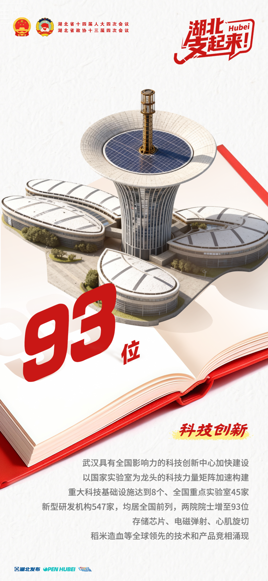 武汉具有全国影响力的科技创新中心加快建设,以国家实验室为龙头的科技力量矩阵加速构建,重大科技基础设施达到8个、全国重点实验室45家、新型研发机构547家,均居全国前列,两院院士增至93位,存储芯片、电磁弹射、心肌旋切、稻米造血等全球领先的技术和产品竞相涌现。