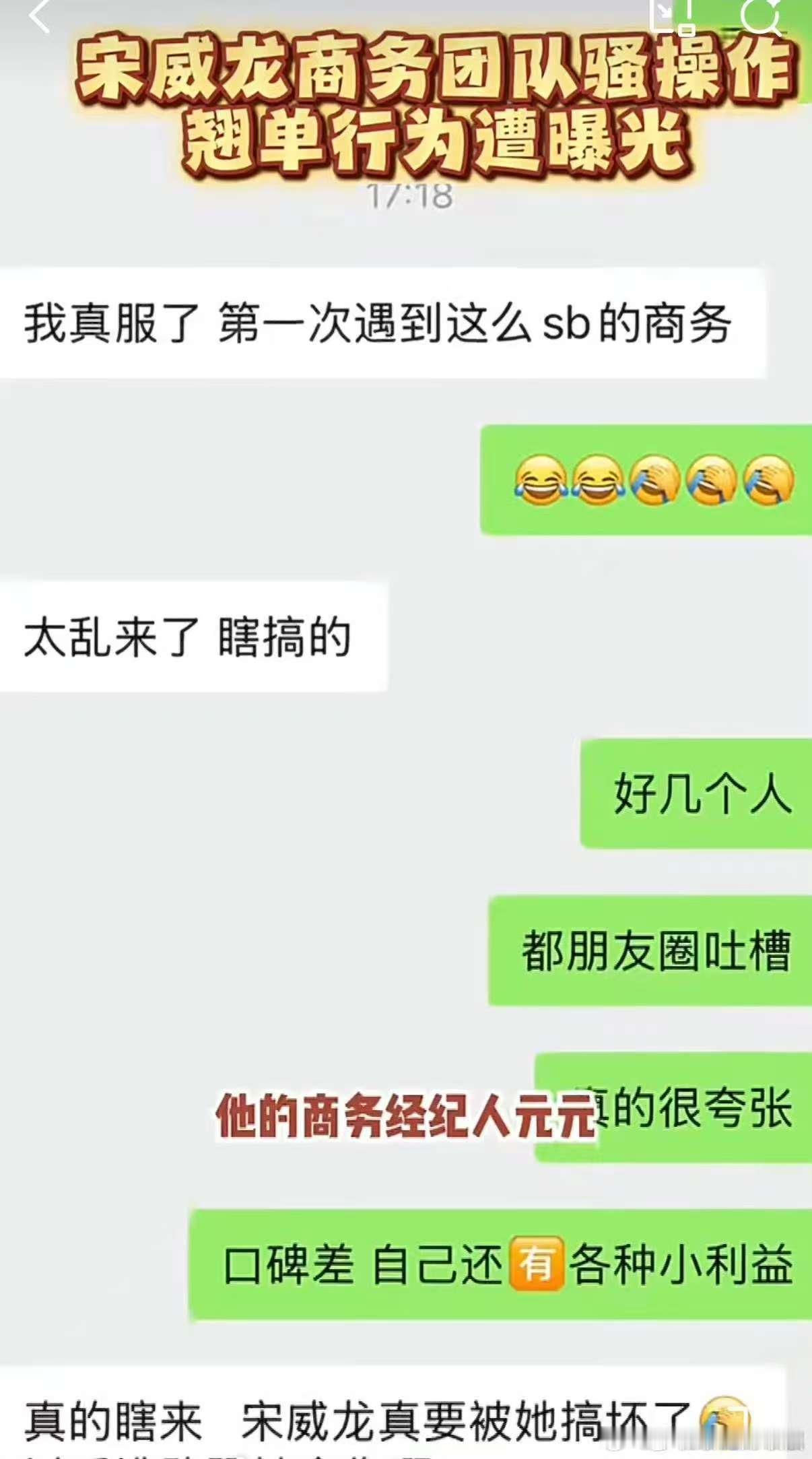 有博主发了一段聊天记录,称自己被宋威龙商务团队一个叫“元元”的工作人员跳单,本来两边谈好的事情,结果宋威龙商务团队直接去找了品牌方谈合作。好像之前宋威龙粉丝就说过宋威龙在于正公司的时候就经常跳过公司接外戏,粉丝说是因为被于正雪藏但是于正说自己从来没有雪藏过宋威龙,你们怎么看🤔
