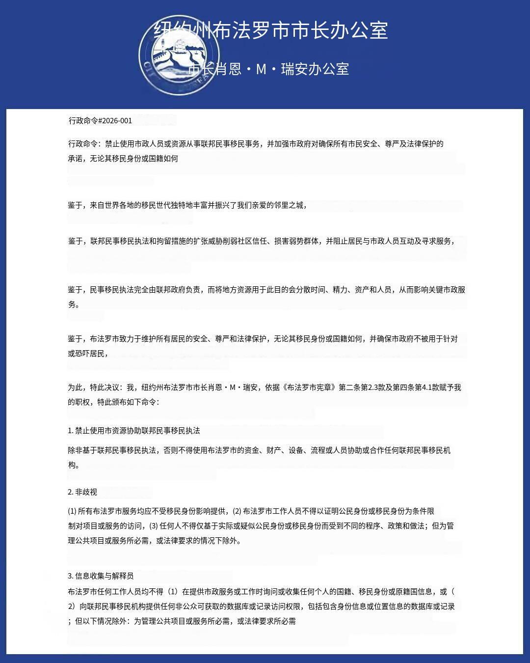 新闻快讯——纽约州布法罗,2026年1月27日——布法罗市市长肖恩·瑞安签署第2026-001号行政令,正式禁止该市人员与资源协助联邦移民与海关执法局(ICE)的民事移民执法行动,成为又一个限制与联邦移民部门合作的美国城市。 该行政令明确要求: - 禁止城市资金、设备或人员为ICE执法提供支持 - 所有公共服务不得因移民身份区别对待,禁止收集或共享居民的移民身份信息 - 限制ICE进入城市设施,禁止参与任何联邦移民执法合作协议 - 保护所有居民的正当程序权利,不得仅因移民身份拘留或移交人员 布法罗市表示,此举旨在维护社区信任,确保居民不因移民身份而不敢寻求公共服务。这一政策呼应了近期明尼阿波利斯ICE枪击事件引发的抗议浪潮,也凸显了美国地方政府与联邦政府在移民执法问题上的持续对立。