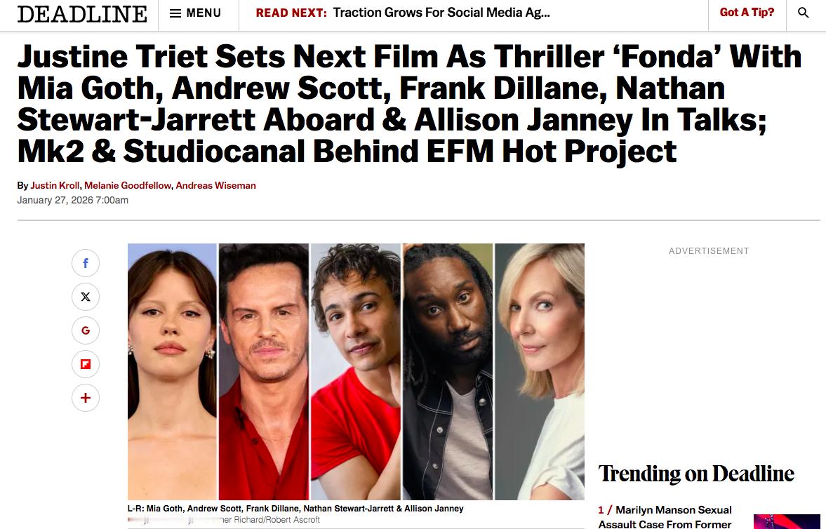 TNABO “坠落的审判”编导茹斯汀·特里耶新片《方达》阵容敲定:米娅·高斯安德鲁·斯科特弗兰克·迪兰内森·斯图尔特-贾瑞特艾莉森·珍妮(商洽中)这部影片是编导茹斯汀·特里耶的首部英文长片,也是一部心理惊悚片,聚焦被悲伤与执念主导后的心智。电影还请回了《坠落的审判》制片班底,并将在柏林电影节的欧洲电影市场上销售。