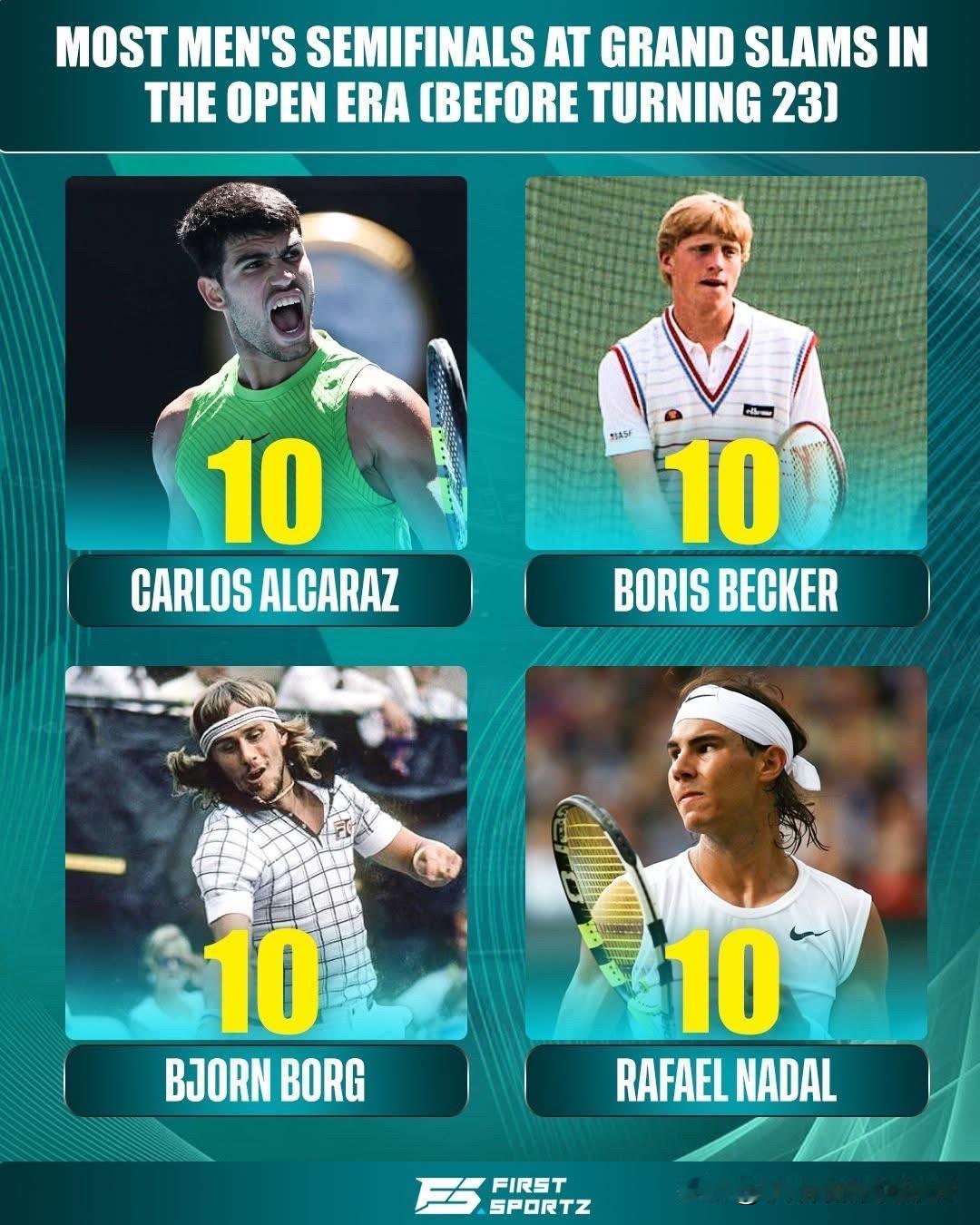 公开赛时代(23岁之前)男子单打大满贯半决赛次数最多的球员 : 🇪🇸 卡洛斯·阿尔卡拉斯 - 10 🇩🇪 鲍里斯·贝克尔 - 10 🇸🇪 比约恩·博格 - 10 🇪🇸 拉斐尔·纳达尔 - 10 阿尔卡拉斯也是公开赛时代第二年轻的10次大满贯单打半决赛选手,仅次于拉斐尔·纳达尔。 网球 网球历史地位