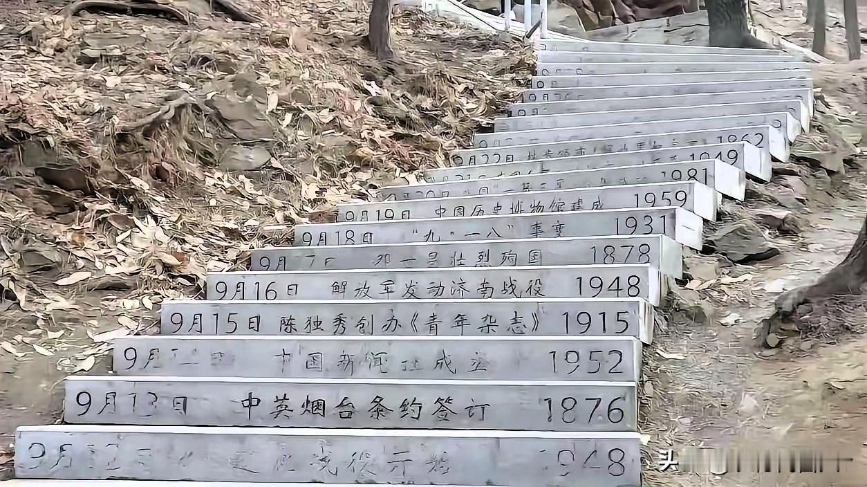 爬山时撞见一段特别的石阶——每一级台阶上都刻着日期和对应的历史事件:9月18日的“九一八”事变、9月16日的济南战役、1876年的中英烟台条约……脚踩在台阶上,像一步步走过时光的刻度。 这些刻在石头上的字,不是冷冰冰的数字,是先辈的热血、民族的阵痛,也是时代的脚印。平时总说“铭记历史”,可真当这些事件以这样的方式铺在眼前,才更懂“以史为鉴”不是一句空话。 石阶旁的落叶会年年更新,但刻在上面的记忆该留在心里——每一步前行,都该带着对过往的敬畏,才走得更踏实。