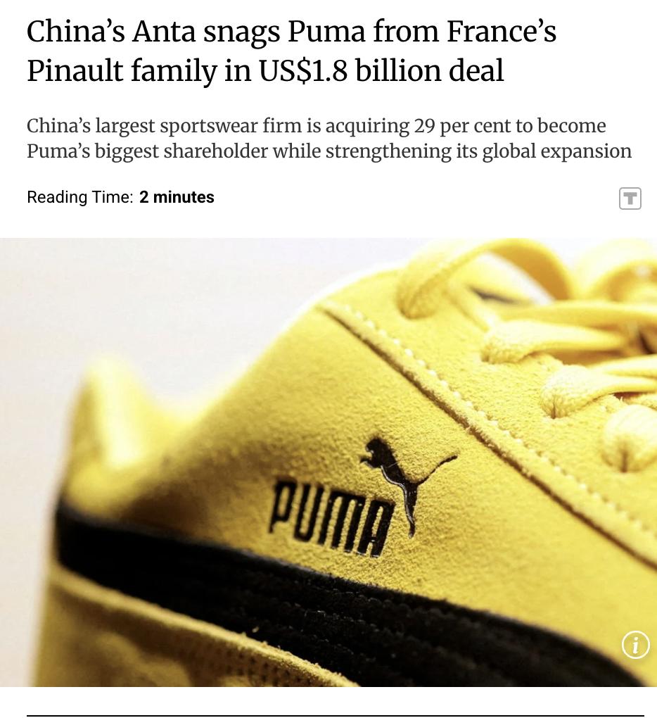 外媒:中国运动品牌巨头安踏以18亿美元收购法国皮诺家族旗下Groupe Artemis所持有的德国品牌彪马29%的股份,成为彪马最大股东。 此次收购将加速安踏的多品牌全球化战略,预计年底完成。安踏董事长丁世忠表示,彪马是具有深厚底蕴的全球标志性品牌,双方将携手释放其潜力。 安踏自2018年以来收购不断,包括64亿美元收购芬兰的Amer Sports等品牌。 皮诺家族2007年获得彪马控股权后逐步减持,但一直是最大股东。
