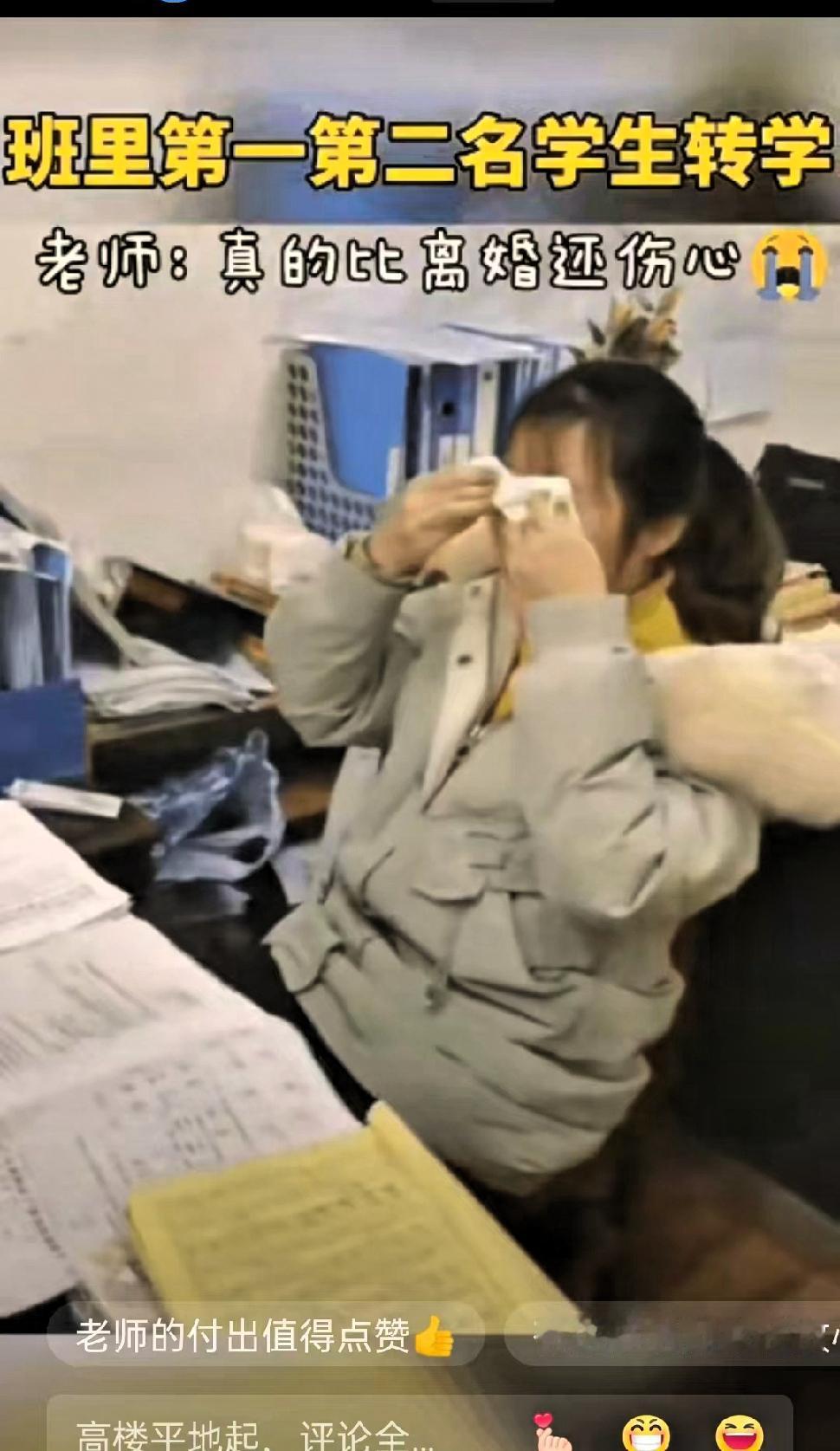 湖北某中学,一名女教师下课回到办公室后突然失声大哭,只因一周内班里前两名接连转学,坦言心里比离婚还难受,这份难过不是矫情,而是身为班主任,实打实的责任心和不舍,特别能让人共情。 能看出来老师哭的从不是影响成绩、关乎绩效,而是心疼自己一点点攒起来的班级学习氛围,怕因为两个孩子的离开被打散,更担心班里其他孩子没了尖子生的带动,学习劲头会受影响,毕竟一个班级的学习风气,是老师花时间和心思慢慢磨出来的。 她的这份在意,恰恰是基层班主任最真实的样子,把班级当成自己的小家,把每个学生的成长放在心上,操心着整体的学习状态,不是只盯着分数,而是真的在乎这个集体的每一点变化。尖子生转学,对老师来说,更像是用心培养的小苗,突然换了土壤,心里又空又慌。 其实尖子生转学,是家庭为孩子选择更好的发展路径,这本无可厚非,每个家庭都有自己的考量,老师心里纵使不舍,也终究理解。只是这份离别带来的担忧,是班主任的本能,毕竟班风的维系,离不开集体的互相带动。 但换个角度想,这对班里其他孩子来说,也是一次难得的机会。第三名、第四名的孩子,能借着这个契机站出来,成为新的班级榜样,慢慢扛起带动班级的担子,只要老师的引导还在,班级的底子还在,学习氛围就不会轻易散。 教书育人的路上,相遇和离别本就是常态,这位老师的真心,不会因为两个孩子的离开白费,她对班级的用心,班里的其他孩子都能感受得到。有这样负责任、把学生放在心上的班主任,是孩子们的幸运。