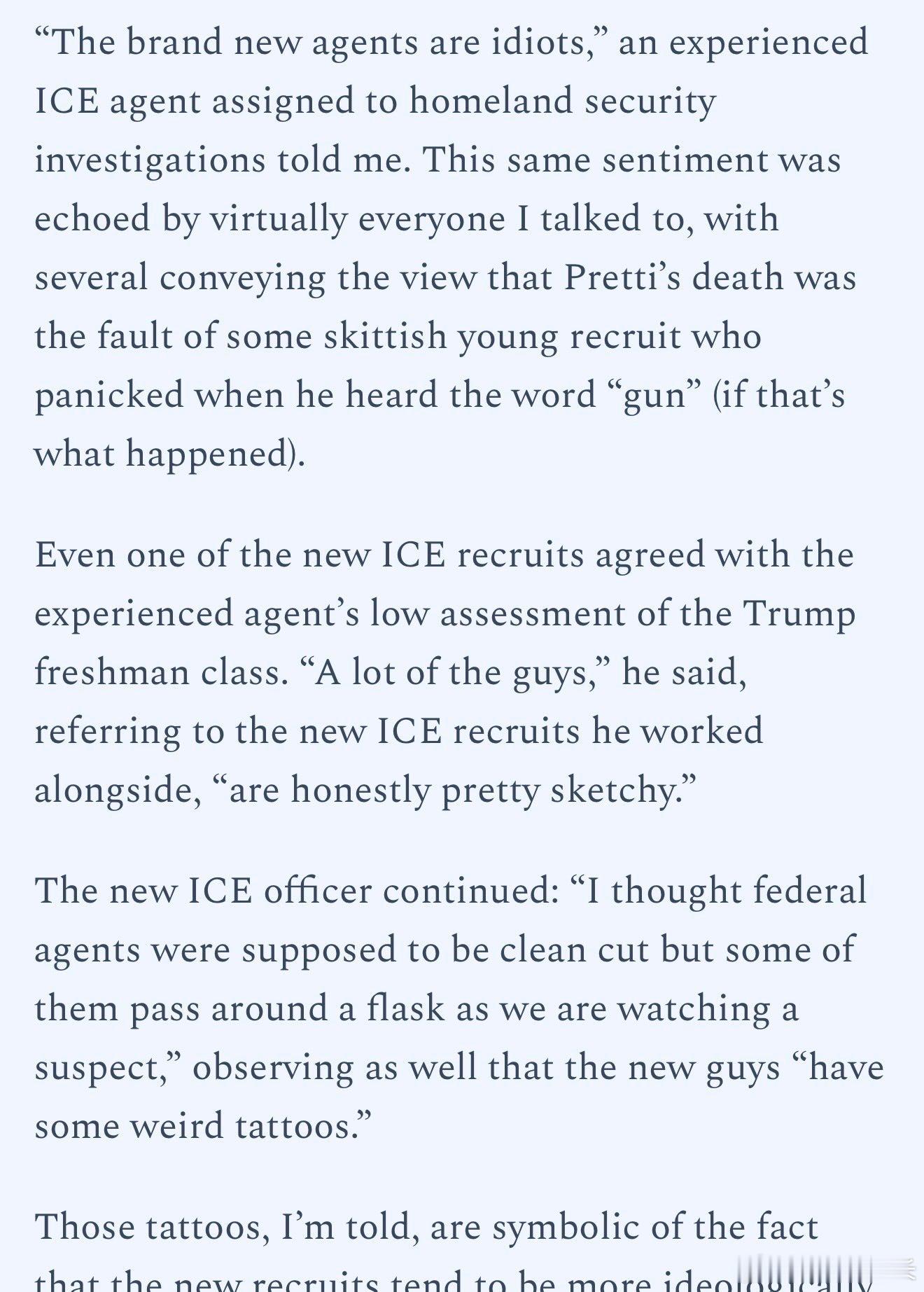 "这些全新的探员都是白痴,"一名被指派负责国土安全调查的资深ICE探员告诉我。我采访的几乎所有人都表达了同样的看法,其中几人还认为,普雷蒂(Pretti)之死是某个惊慌失措的年轻新兵的错——据说他在听到"枪"这个词时慌了神(如果事情真是这样的话)。就连一名ICE新兵也认同这位资深探员对特朗普政府这批新人的低评价。"很多人,"他说,指的是和他一起工作的新ICE 新丁,"说实话相当不靠谱。"这名ICE新探员继续说道:"我原以为联邦探员应该是干净利落的那种,但他们有些人在监视嫌疑人时竟然互相传递酒壶,"他还注意到这些新人"有一些奇怪的纹身"。据我所知,那些纹身象征着这些新兵往往在意识形态上更加……海外新鲜事热点观点