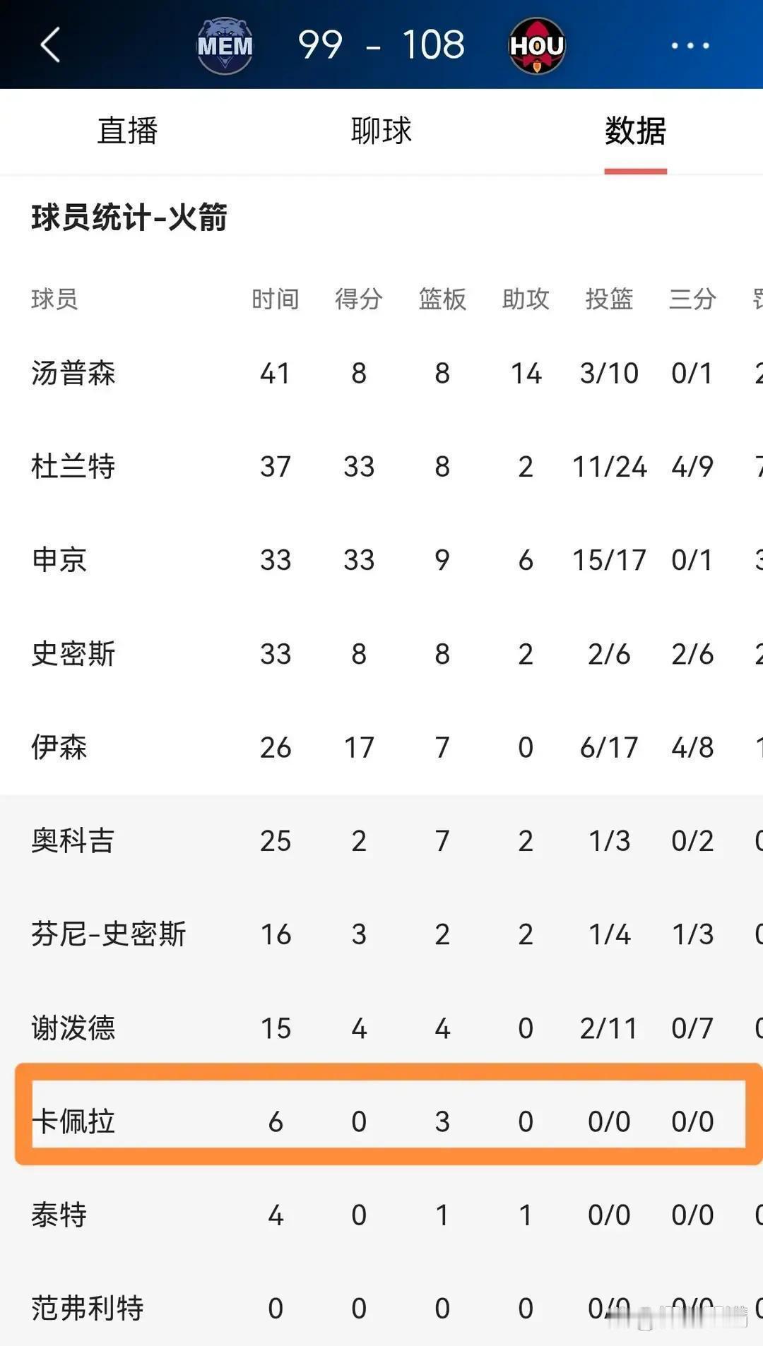 谁也没想到,那个曾单场18分17板、被称作“饼皇”的卡佩拉,如今在火箭主场赢球的夜晚,只打了6分钟,0出手、0得分、3篮板、正负值-7,全队垫底! 不是伤病,不是停赛,而是教练组连垃圾时间都只敢“施舍”他5分多钟。更扎心的是:他合同还剩3年2150万,命中率看着挺高(64%),可一上场就拖节奏,护框变漏勺,移动像踩棉花,连最拿手的“吃饼”都接不稳了。 不是他老了,是NBA真不等传统中锋了,不会投、不换防、没空间,再硬的饼也喂不熟一支争冠球队。乌度卡宁愿上五小搏速度,也不愿赌他一次空切。 当年休赛期那笔5500万三中锋豪赌,不是压错了宝,是整个建队逻辑,已经和时代脱节了……