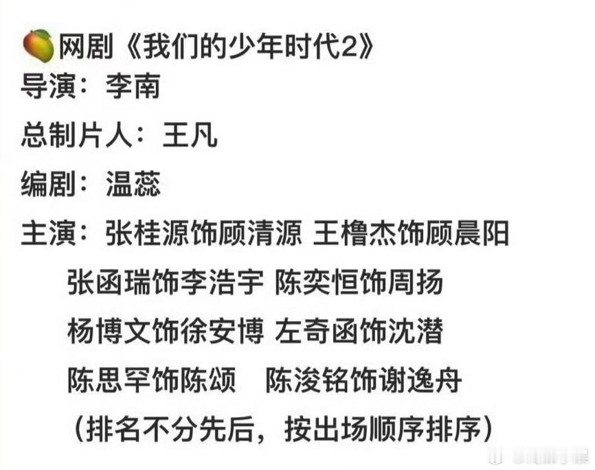 我们的少年时代2 将于2月10日在海口开机:张桂源 饰演 顾清源王橹杰 饰演 顾晨阳张函瑞 饰演 李浩宇陈奕恒 饰演 周扬杨博文 饰演 徐安博左奇函 饰演 沈潜陈思罕 饰演 陈颂陈浚铭 饰演 谢逸舟