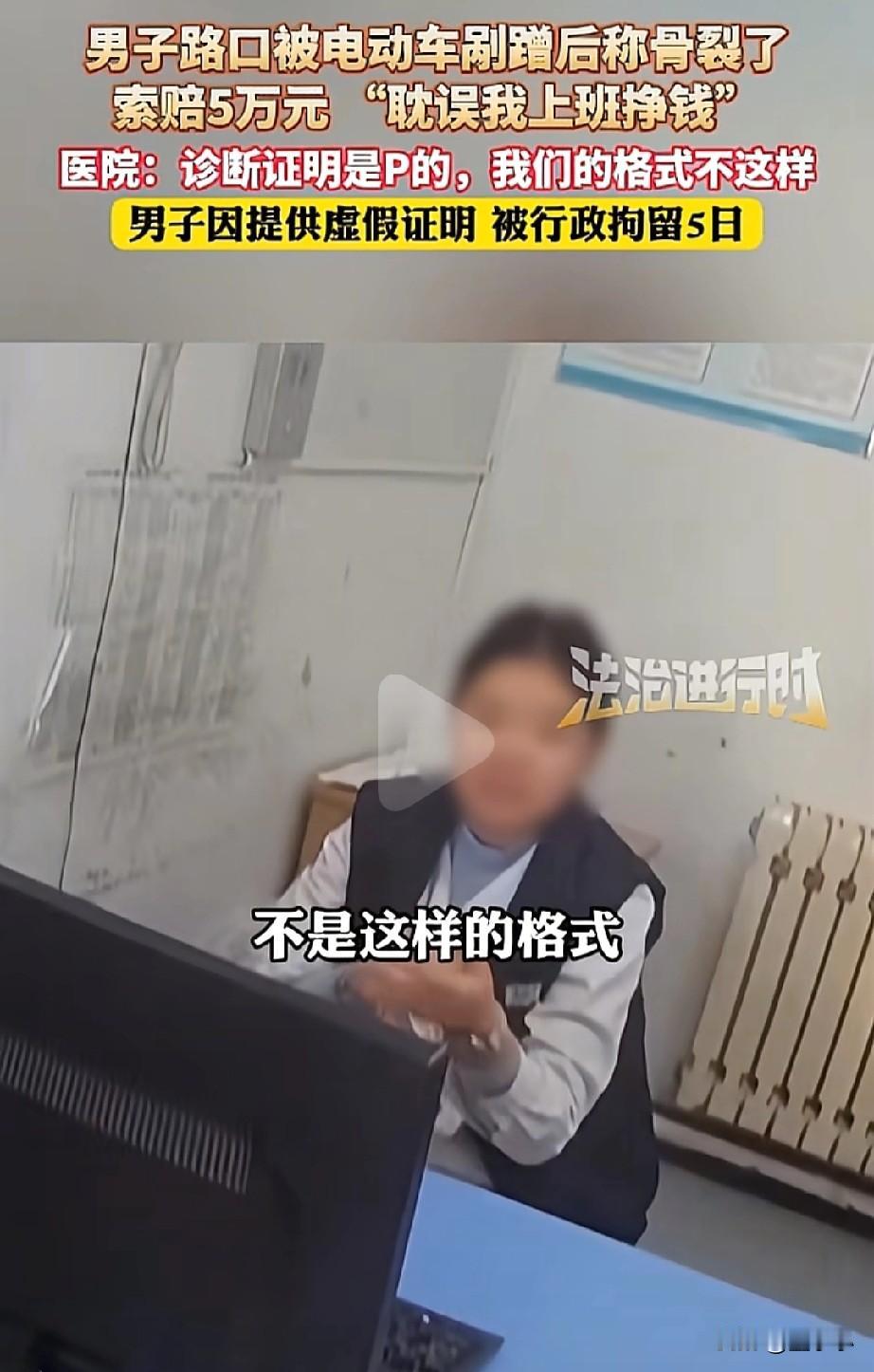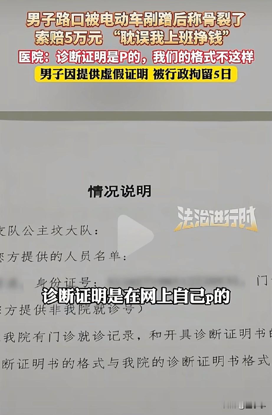 “穷疯了!”为了钱,自己竟然在网上p的医院诊断证明,来忽悠大家,不过看到结果后,真的是大快人心。 (信息来源:法治进行时) 根据报道了解到,男子在过马路的时候,正好一位骑车的行人从他身边过去,电动车车主碰倒了该男子,男子就索要了5万的赔偿金。 原因是,自己被电动车剐蹭后骨裂了,耽误了自己上班,导致自己不能挣钱了,休养费,营养费,最少得给5万。 既然,有伤那就得有医院的诊治报告,男子也确实拿出了诊治报告,但这样的情况,也让电动车车主不理解,自己骑车的时候,只是轻轻碰倒而已,根本就造成不了骨裂的情况,怀疑有猫腻。 电动车车主要求验证诊治报告和诊治证明,但地方却直接拒绝,就这举动更加让车主怀疑。 不过好在经过第三方,男子还是拿出了诊治报告和证明,来到相应的医院里面,这一查看不得了。 医院的工作人员称,这个证明是假的,一看就是p的,因为我们医院的格式不是这样的。 有了指认,男子也承认了自己这个证明是在网上p的。 因为,男子提供了虚假证明,一分钱没有得到,反而还被拘留了5日。 此事引发热议! 有网友表示,太贪心了,本来可以弄个几百千把的,结果把自己弄进去待五天。 也有网友表示, 为了钱,什么事情都做,这种人就判刑5年都没有问题。 大家怎么看?