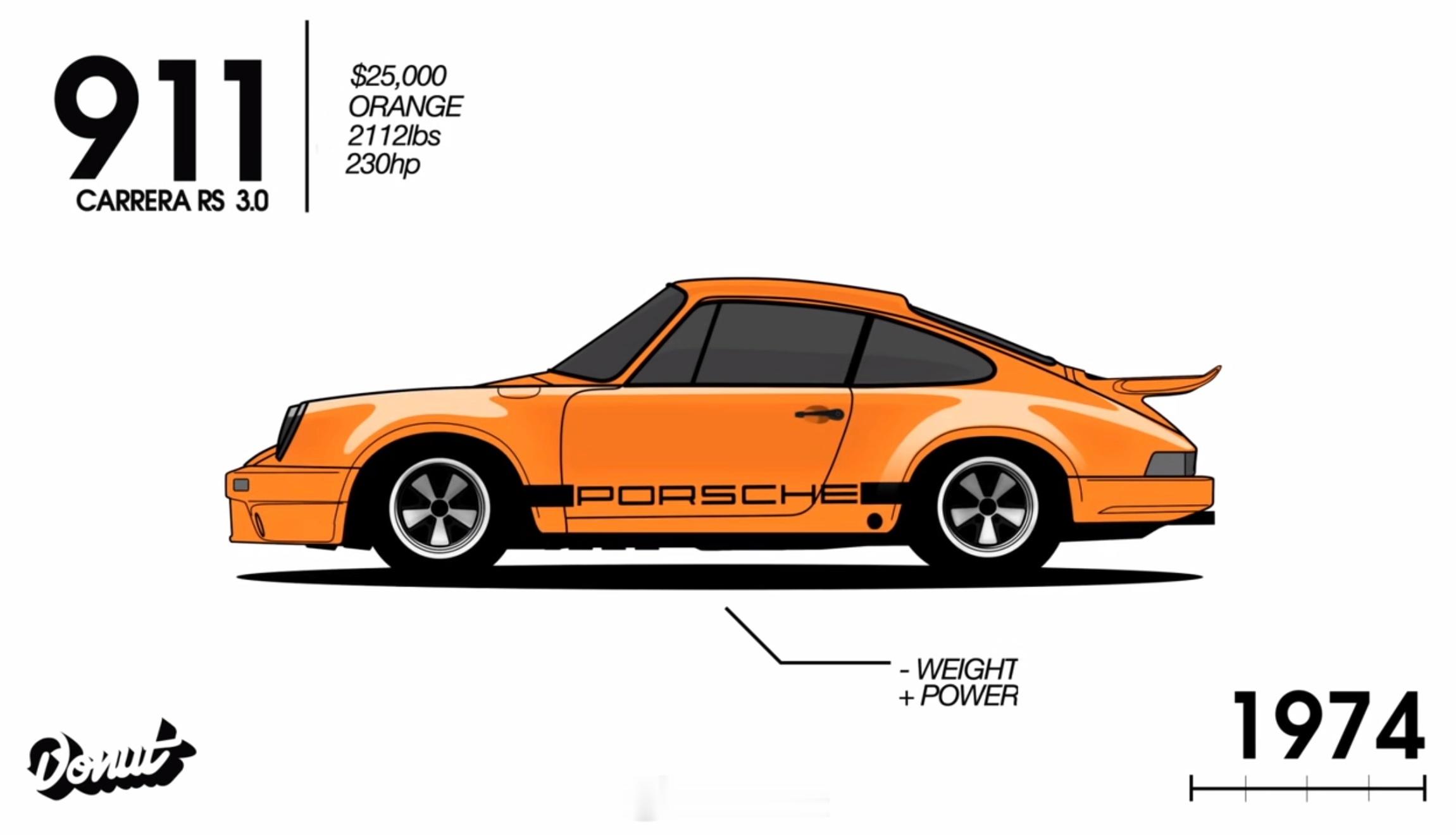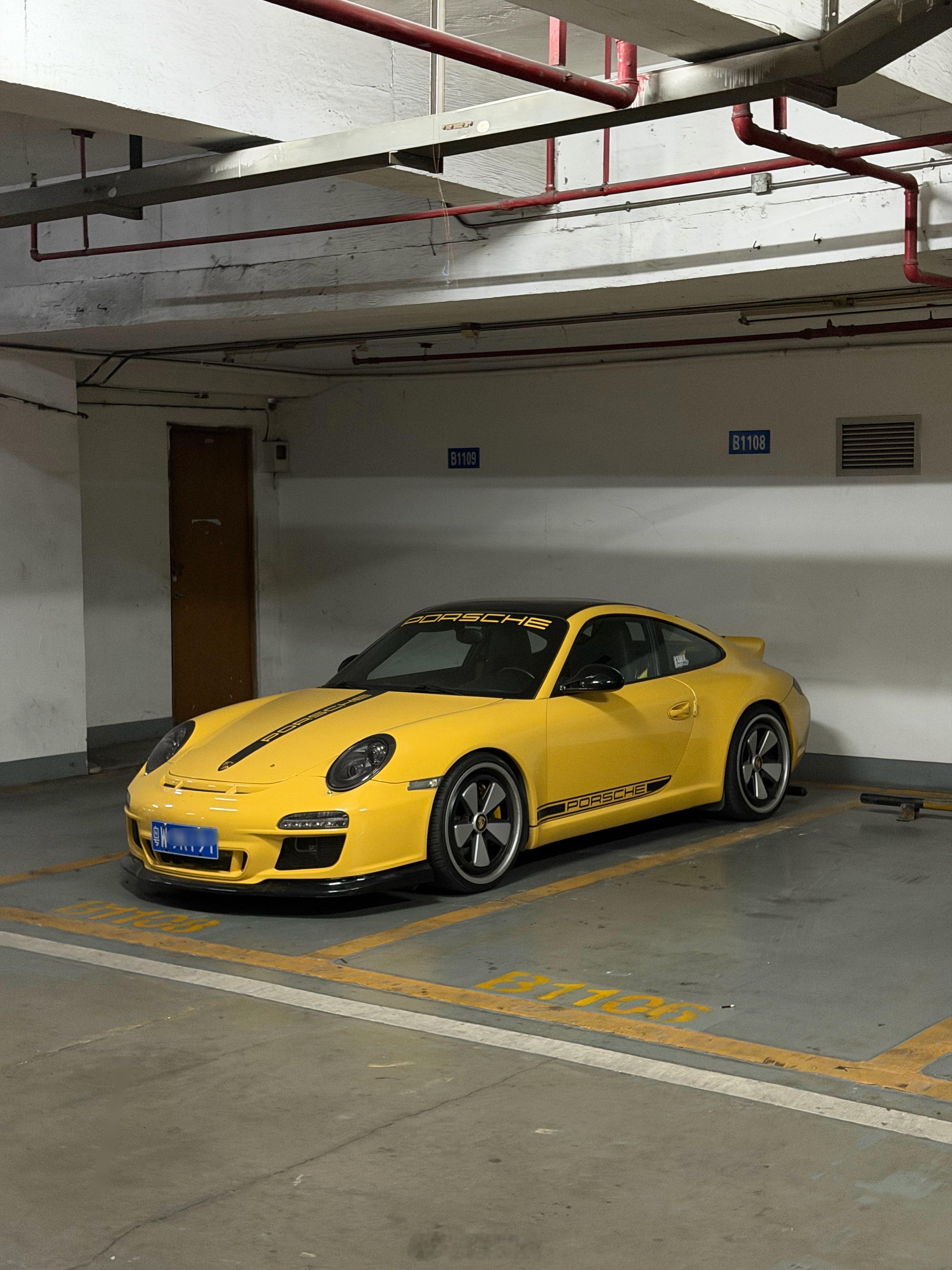 保时捷 地库有一辆 997 有好几天没人开了,每天路过都能见到它。这套 60 年代风味的 Fuchs 轮毂真的很特别,用在现款 911 上既精神又经典。值得一提的是,这车的黄色车漆和侧面的拉花是按照 1974 年款的 911 Carrera 做的经典拉花(图二是示意图),车尾的扰流板也同样做了复古改装。只能说,大哥真有品。