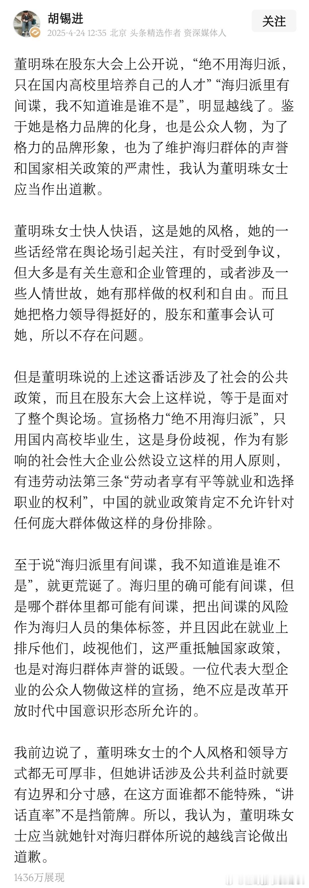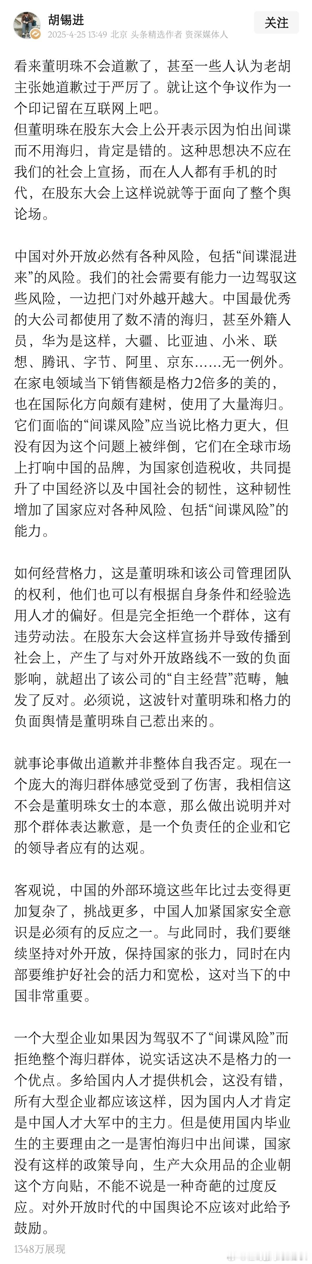 老胡掐董明珠的时候不是这样的... 董明珠说绝不用海龟,老胡莫名其妙的急了,跳起来猛批董明珠,让董明珠道歉... 不知是啥原因让老胡如此跳脚愤怒呢?逼着董明珠道歉?