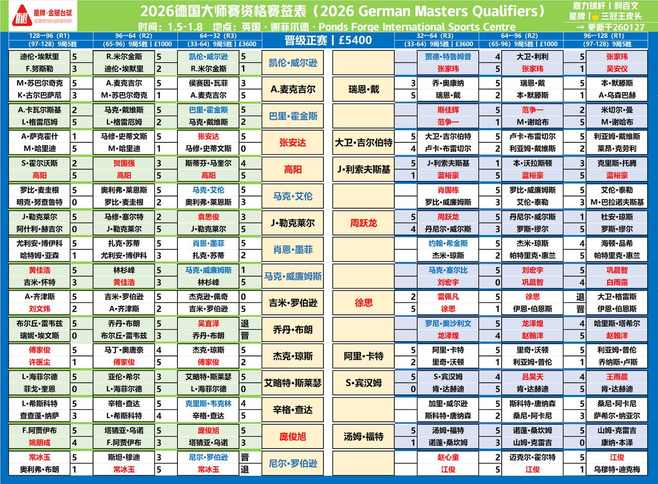 德国大师赛,肖国栋、赵心童、斯佳辉等顺利进入16强。 第一局赵心童还比较紧张,差一点输球,江俊准度不错,给心童带来压力,最后的粉球,江俊失误给了赵心童机会,赵心童拿下粉球和黑球,逆转成功。 后面的比赛进入了赵心童的节奏,顺风顺水,一鼓作气,5-0取得了最后的胜利,最后一局,赵心童冲击147,打进很多难度球,最后长台进攻红球失误,拿到104分。赵心童下一个对手汤姆福德,福德这段时间状态不错,刚刚拿了冠军联赛第一小组的冠军,德国大师赛资格赛5-1赢了实力强劲的桑坎姆。看看赵心童如何应对福德。 肖国栋5-2赢了罗比威廉姆斯,下一个对手是利索夫斯基。 斯佳辉5-2赢了范争一,下一个对手是土豆哥吉尔伯特。 目前,奥沙利文和龙泽煌的比赛还在打,双方打的都不太好,目前比分奥沙利文3-1领先,火箭这一次没有退赛,算是很给德国面子。 塞尔比3-1领先刘宏宇,唐纳森3-1领先加里威尔逊。