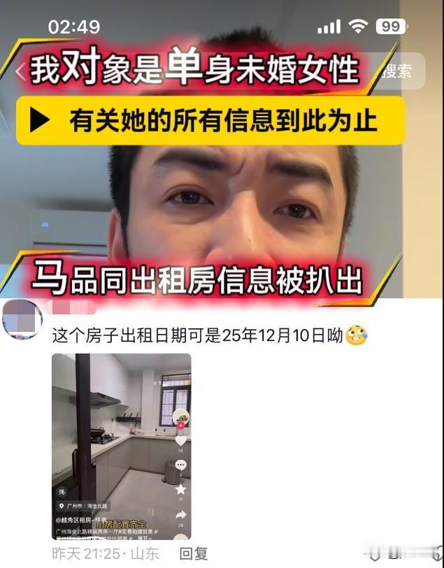 马品同罕见的发脾气了,他对着镜头严正发表声明,并狠狠怼了个别网友,称他们“别有用心”。 马品同对同居女朋友的身份特别做出说明“她是单身未婚女性,条件比我好,以后关于她的所有信息到此为止”。 随后在他的这条视频的评论区里,有一位网友发布了一条带图评论,指出这条租房信息与马品同在广州租住的出租房信息,高度相似。网友晒出的出租房信息发布时间是12月10号。这个时间节点与马品同从北京到广州的时间线基本吻合。 网友的意图很明显,马品同与女友在广州租房拍视频,做自媒体。 而关于住房这件事马品同避而不提,很多人以为是条件好的女朋友在广州自有住房。 其实关于房子的这件事情,究竟是租的还是个人买的,与其他人关系确实并不大。网友晒出这样的图,可能是希望马品同把自己交代的更彻底。 马品同讲述过自己的一次经历,他在北京的家里开直播,有一位年长的阿姨不打招呼,不请自来的到他家里去,目的是想看看马品同镜头里的家,真面目究竟如何。陌生人上门打扰,令马品同及父母都非常反感,他认为这是无聊的人,极其没素质的表现。 马品同赶上了互联网时代,做自媒体开直播带货淘到了金,他曾经认为每月能赚一万块钱就很满意,免去风吹日晒等至少比打工强。 马品同在自媒体这条赛道上为此很努力。 要做自媒体当然离不开素材。马品同在北京的家里拍了很久,关于爸妈和猫咪,关于厨房和院落,甚至换沙发套,擦洗厨房,都成为马品同的拍摄素材,春去冬来,二环里几十平方反反复复已经拍不出新鲜感了,时值北京的寒冬腊月,户外冷的伸不出手。 四十多岁离异单身的马品同决定南漂广州,称与相识7个月的女朋友网络奔现,开启同居生活。 感情生活分分合合是个动态发展的过程,这个话题本身就很有创造性,作为有自媒体人经验的马品同,他很清楚这是个可以长期拍摄的生活素材,不仅颇具想象力的空间,也能调动起粉丝们追剧的兴趣。 让马品同意想不到的是,他的观众对女朋友的身份格外好奇,一副打破砂锅问到底的架势。还处处捕捉他前后不一致的言行。 马品同被整破防了,罕见的对粉丝发脾气。