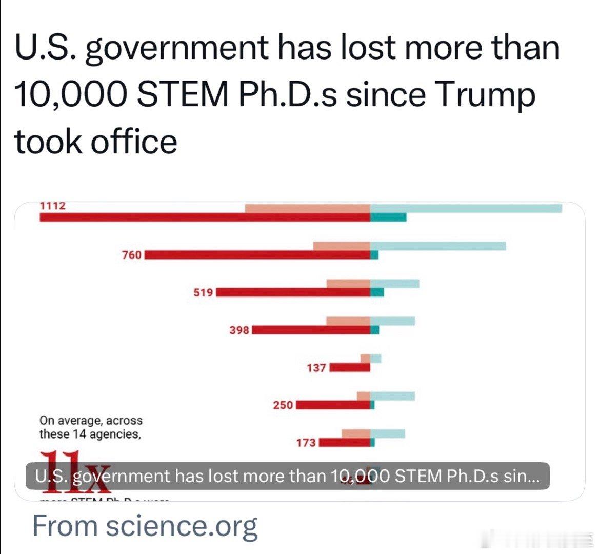 美国联邦政府,2025年失去一万多名有STEM专业博士学历的员工卫生部最多:国家健康研究院、药监局、疾控中心,少了2400名博士其次是环保、农业、气象等部门