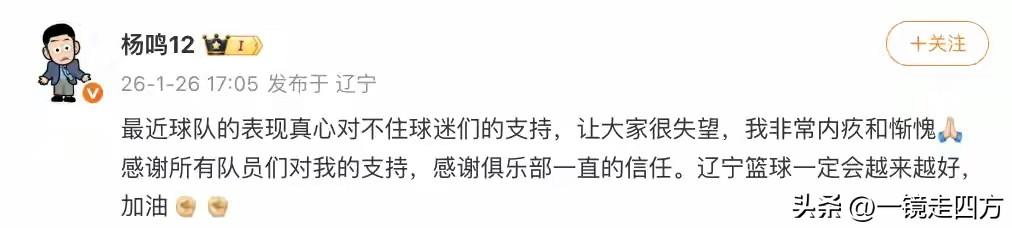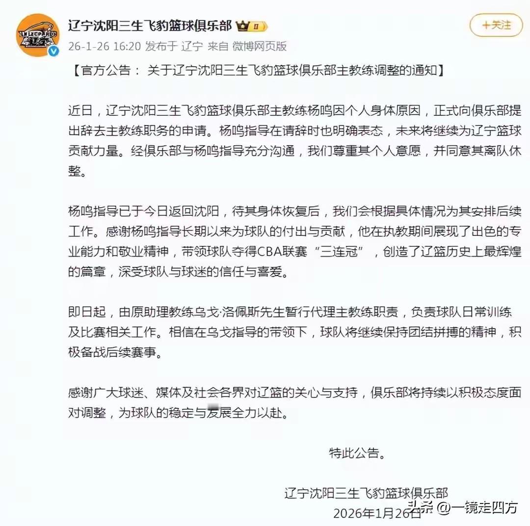 辽宁男篮官宣主教练杨鸣因个人身体原因辞去主教练职务后,杨鸣在社交平台发文称:“最