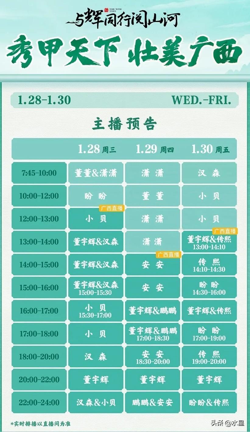 与辉同行发布广西行排班表 今天13点可以看到董宇辉的直播 他已经到北海,大晚上的
