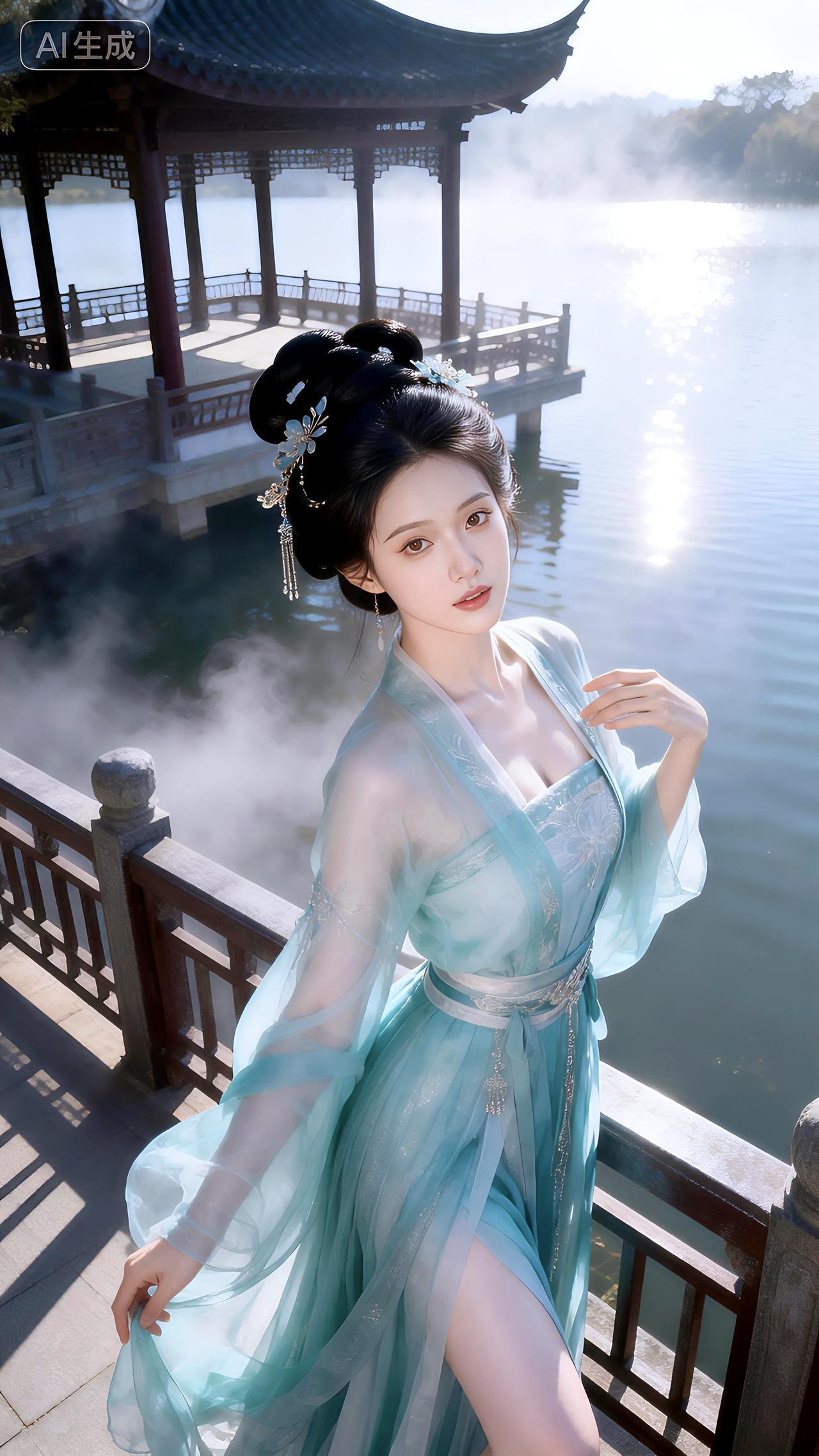 烟波水榭凭栏处,碧衣云髻画中仙。豆包壁纸