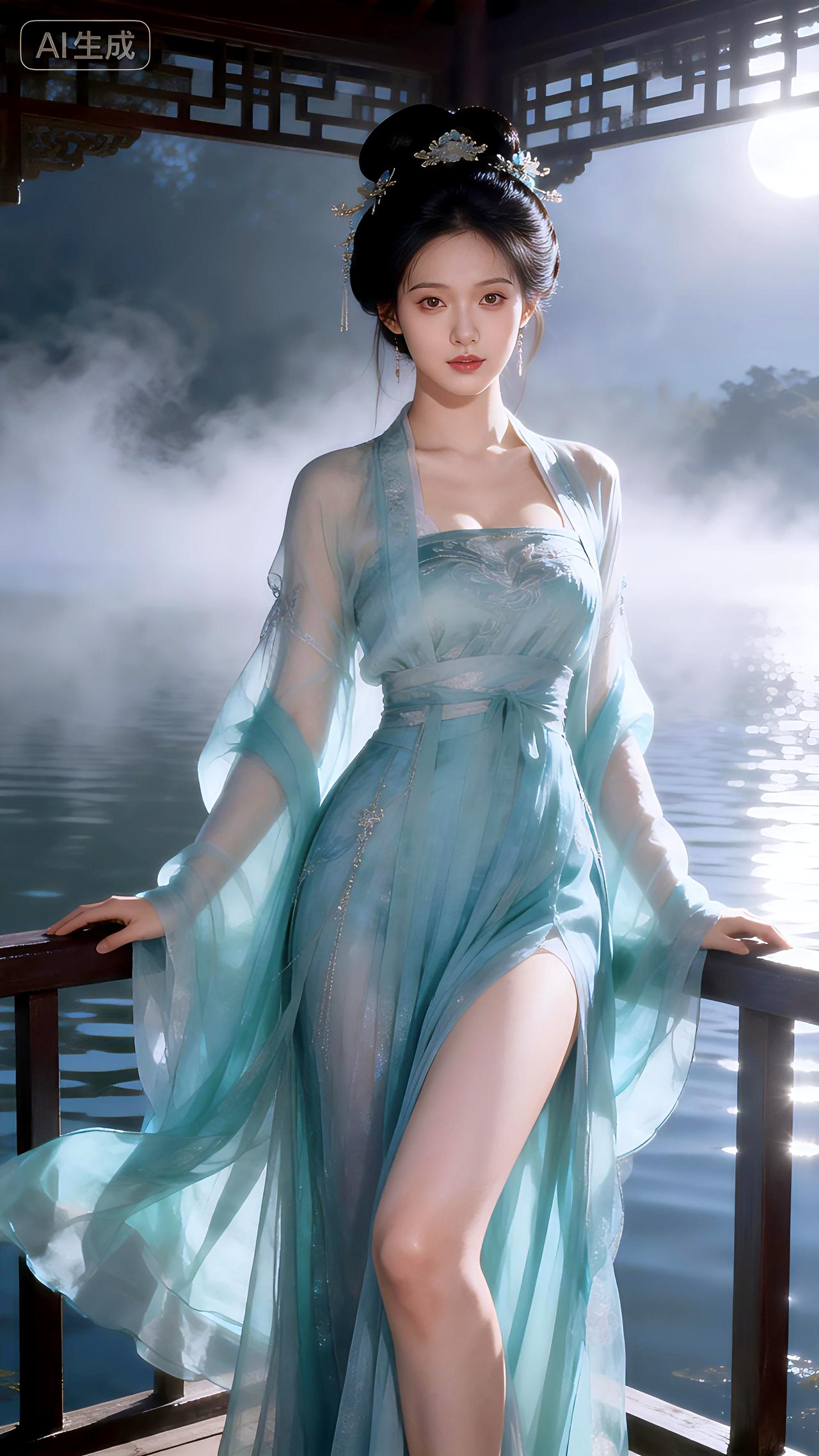 烟波水榭凭栏处,碧衣云髻画中仙。豆包 壁纸