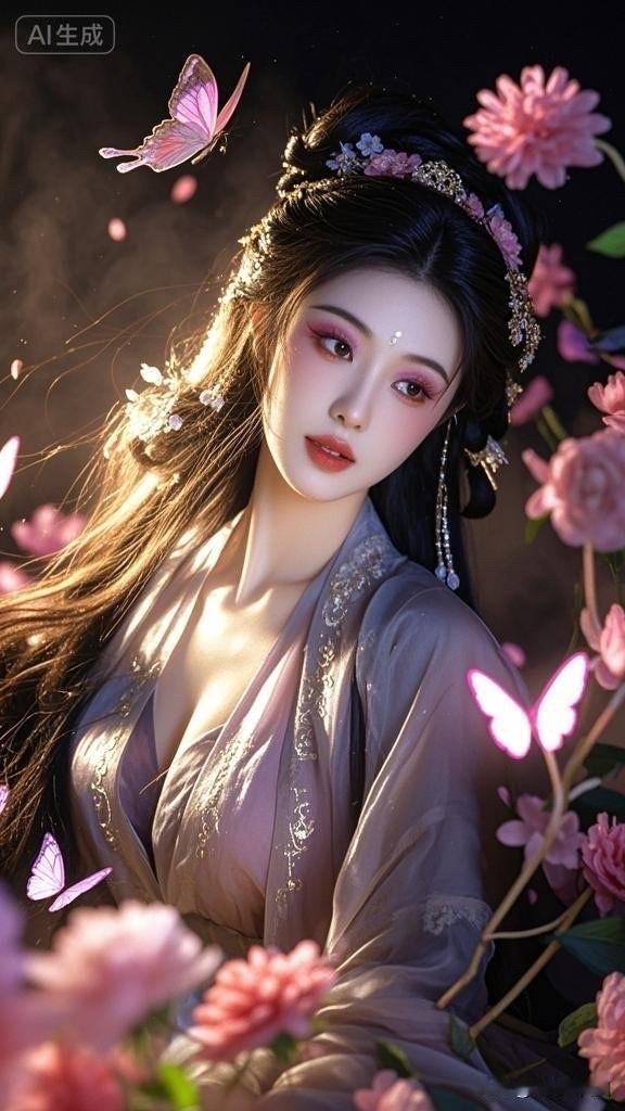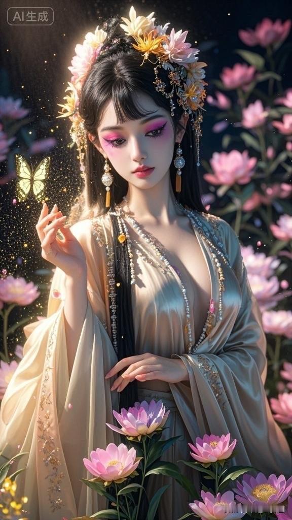 梦幻仙境中的古典美人,花海中的优雅姿态