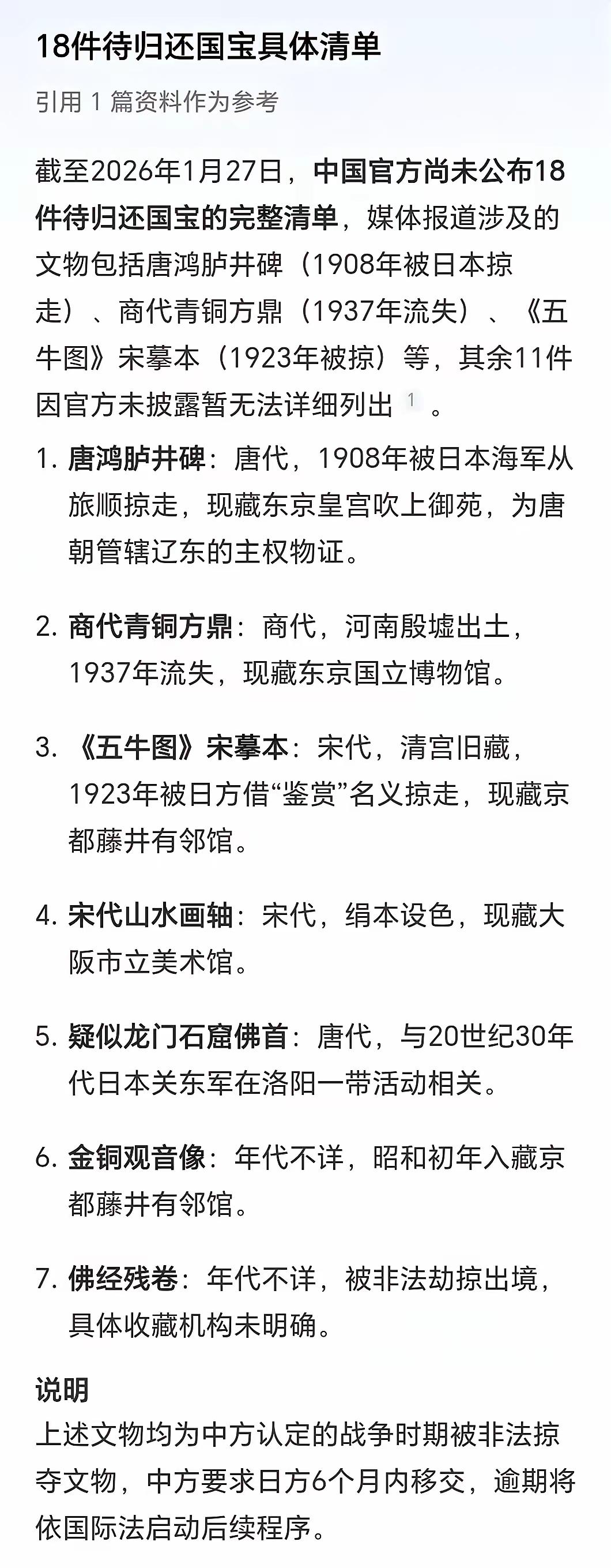 中方认定战争时期被非法掠夺的首批18件文物,要求日方6个月内移交,逾期将依国际法启动后续程序。 ​这事儿可真让人来气。一块中国自己的大石头,被人抢走了,想看一眼都不行。 这颗让国人揪心的大石头,是重逾9吨的唐鸿胪井碑,刻着29字佐证唐代管辖辽东的铁证,1908年日军将它连碑亭拆走,藏在日本皇宫建安府百年,咱老百姓隔着山海连看一眼都是奢望。 这18件文物件件都是血证,唐鸿胪井碑是核心,还有商代青铜方鼎等珍宝,全是战争中被日方非法劫掠,而甲午到二战,日本从中国掠走的文物超360万件又1807箱,古迹被毁741处。 百年来追国宝的路满是憋屈,中方曾靠回购、民间捐赠找回部分文物,日方却拿“合法持有”推诿,甚至将掠夺文物藏于皇室禁区,连学者的考察请求都蛮横拒绝。 这次中方直接亮出铁证,368份历史档案、日军搬运令原件汇成完整证据链,《唐鸿胪井碑档案文献总汇》更是把每一步掠夺过程都摆得明明白白,容不得半分狡辩。 国际法就是我们的硬底气,1954年《海牙公约》明确战争掠夺文物必须归还,且不受时效限制,日方扯的“皇室财产”就是无理狡辩,皇室事务本就归其政府全权管控。 中方这次根本不惯着日方的拖延套路,不是软磨硬泡的协商,而是态度强硬的正式通知,6个月内必须移交,逾期便依国际法启动后续程序,从柔性劝还到刚性施压,态度摆明了没得谈。 日方仍有个别机构嘴硬称收藏合法,但其国内早有理性声音,日本民间团体多次集会请愿,历史学家也纷纷发声,呼吁政府正视历史,归还这些来路不正的中国文物。 这些文物从不是冰冷的藏品,是刻着民族过往的鲜活记忆,这次追索不只是争一件物,是替先辈讨回历史公道,任何拖延和推诿,都挡不住国宝回家的坚定脚步。 各位读者你们怎么看?欢迎在评论区讨论。 文物掠夺行为