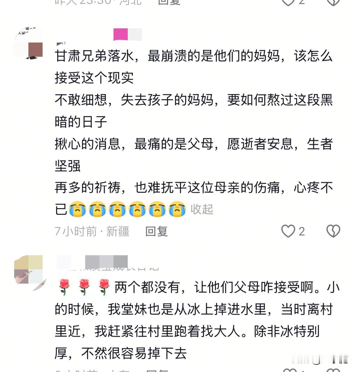 掉进冰窟里双双离世的兄弟俩一个7岁,一个4岁,他们是甘肃甘谷县人。两个小家伙因为