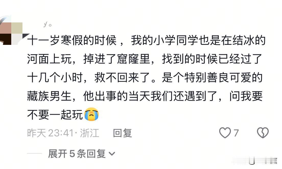 掉进冰窟里双双离世的兄弟俩一个7岁,一个4岁,他们是甘肃甘谷县人。两个小家伙因为贪玩,永远的失去了生命! 悲剧发生在1月24日,天水市甘谷县的4岁弟弟跟随7岁的哥哥趁大人不注意出门游玩,之后,二人迟迟没有回家。起初,家人还以为他们是走远了才找不到回家的路,于是,发动村民到处寻找。 孩子走丢了起码还有一线生机,可没想到,最终,两个年幼的孩子竟在村里的一处水面之下找到了。 他们双双坠进了冰窟里,被人发现的的时候,已经是第二天的早上了…… 寒假才刚刚开始,就发生这样一起令人 痛心的悲剧,真的让人难以接受!一母同胞的亲哥俩同时离开了,陌生人听了都难以掩饰内心的悲痛,真的不敢设想他们的爸爸妈妈此时此刻会是什么样的心情? 每到冬季,结了冰的水面便成了很多人嬉戏的地方,其中,不仅孩子爱玩,很多大人也喜欢去溜冰。 但并不是每一个地方的冰面都会有那么厚实。一旦冰面太薄,或是冰层破碎,人是很容易掉进冰窟里的。这些年里,类似的情况屡见不鲜。如若没有被人及时发现的话,大人都很难靠自己脱险,就不用说孩子了。 所以,这个事情值得大家引以为鉴。 为人父母们,请一定要做到:不要让年幼的孩子单独出门游玩,10岁以下,尽量要有家长陪同。如若真的没办法随行,也务必告诉我们的孩子:出门游玩,必须向大人报备。远离有安全隐患的地方,不要轻易去冰面玩耍,切莫以身涉险! 这对甘肃兄弟真的让人心疼,哥哥也就7岁啊,才刚刚走进小学的大门,而弟弟,还只是幼儿园中班的一个小朋友。好不容易开始快乐的寒假,还有不到一个月就要过年了。结果,兄弟俩却在同一天就离开了。 在此,说什么安慰的话语都难以抚慰这个家庭的悲悸,只愿他们保重好自己的身体![祈祷][祈祷][祈祷]