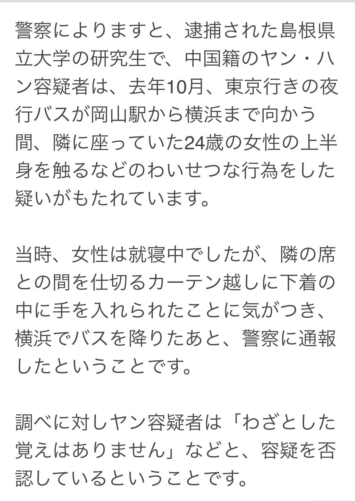 杨某岛根县立大学研究生,涉嫌于去年10月在冈山开住东京的夜间巴士上,对旁边24岁女子的上身触摸等而被捕。 当时女子正在睡觉,感到有人隔着帘子将手伸进了她的衣服里,在横滨下车后向警方报案。 杨某在接受讯问时否认指控,表示:不记得自己是故意这么做的。