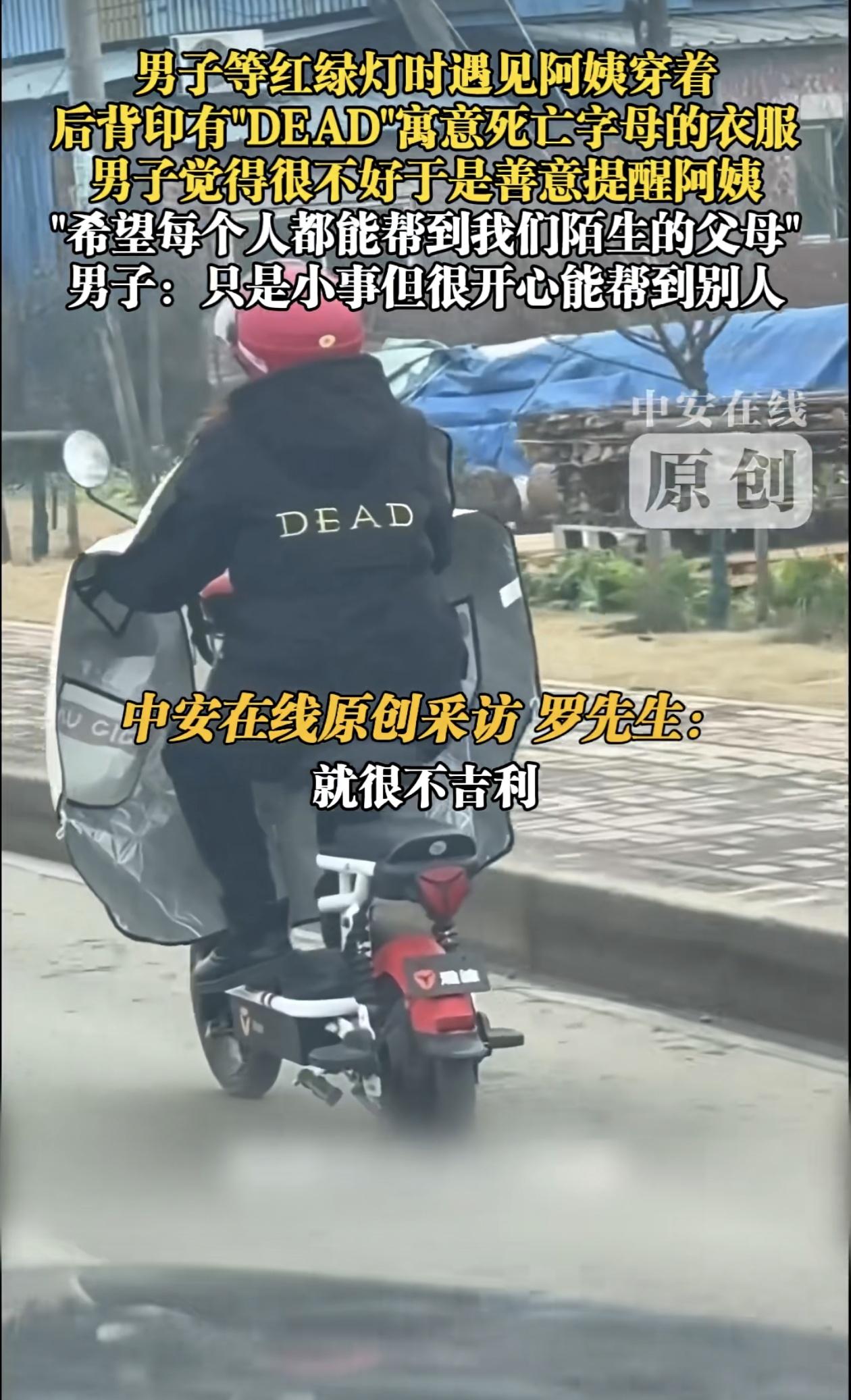 阿姨后背印着EDAD,防范那些利用别人的知识盲点而作恶的人! 在安徽街头,驾车行进的罗先生,无意间瞥见前方电动车阿姨的外套后背印着大大的“DEAD”字样。在英文里,这个词是“死亡”的意思。太不吉利了,什么样的商家才会干出这种缺德事,专门在老人的衣服上做文章,欺负老人们不懂英文,所以罗先生追上阿姨,摇窗提醒阿姨这件衣服不能穿。 录拍视频很快在网上火了。很多人说,这是“陌生人之间最温柔的共情”。 阿姨可能只是觉得衣服款式好看,根本不懂这串字母的含义。而罗先生的提醒,像一个微小的“翻译器”,把年轻人的语境转换成了长辈能理解的“不吉利”。这种换位思考,恰恰是善意最动人的地方。 我们总在说“尊老爱幼”,但很多时候,真正的尊重不是宏大的口号,而是这种“怕你吃亏”的本能。就像我们会提醒父母别乱买保健品,会告诉长辈朋友圈里的谣言是假的。罗先生的举动,本质上是把陌生阿姨当成了自己的家人。 此外,我们要抵防身边的恶,利用英文,特殊符号和暗语造型,进行意识形态上的侮辱和侵蚀!