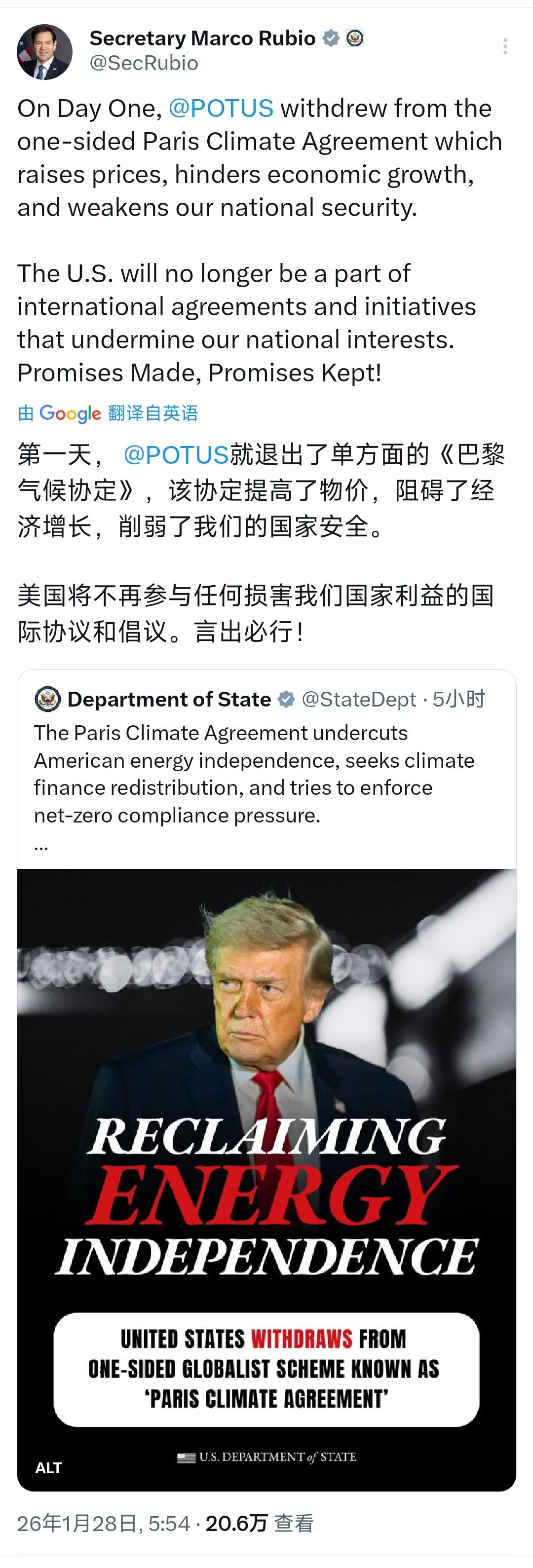 美国国务卿鲁比奥今天(北京时间1月28日)发文写道:“(上任)第一天,特朗普总统就退出了那份单方面的《巴黎气候协定》。该协定会提高物价、阻碍经济增长,并削弱我们的国家安全。美国将不再参与那些损害我们国家利益的国际协议和倡议。言出必行!” [机智]评几句:特朗普政府上任首日退出《巴黎气候协定》,鲁比奥还高调标榜“言出必行”,尽显美国一贯的霸权本色,其动辄退群毁约、在全球搞霸权式欺凌早已成常态。所谓协定抬物价、碍经济、损安全,全是美国为推卸责任找的借口,本质是只顾自身私利、无视人类共同命运。一个真正的大国,理当扛起多边主义大旗、主动承担国际责任,可美国却频频背弃国际承诺,将本国利益凌驾于全球福祉之上,动辄以退群相要挟、靠霸权施压盟友与对手,这般唯我独尊、毫无担当的做派,与大国应有的胸襟和风范相去甚远,也让其国际信誉持续崩塌。