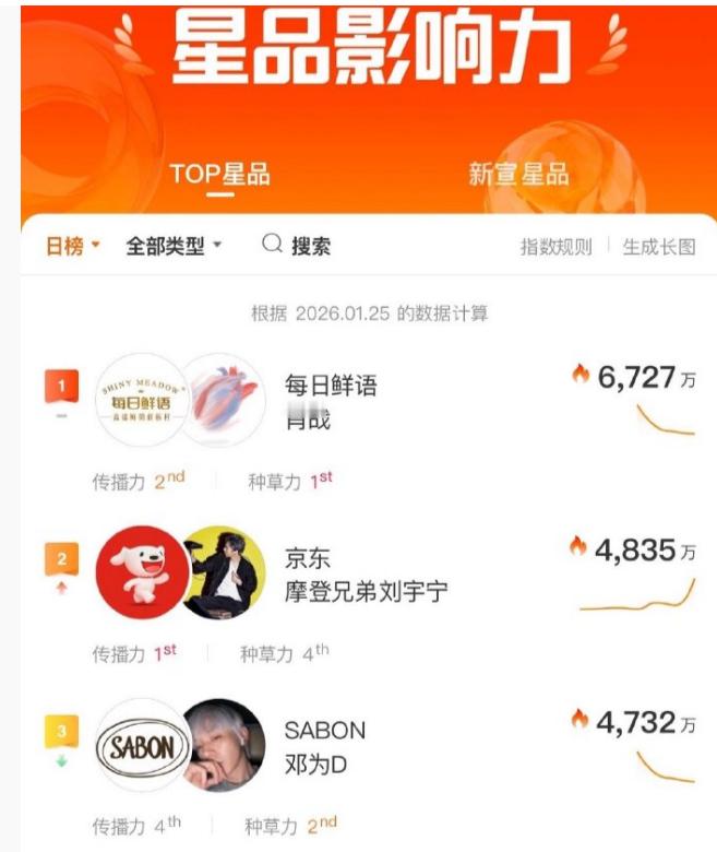 邓为星品影响力最新数据统计时间24日到26日,分别是第二,第二,第三,热度高居不下,钻石们这可是用真金白银投出来的,含金量极高