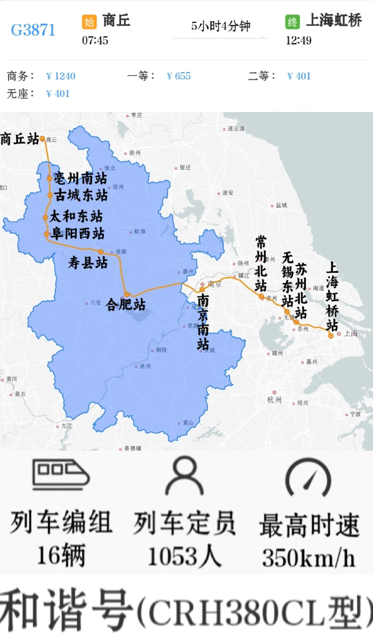 商丘到上海发车时间最早一趟高铁 商丘到上海虹桥G3871/G3874次 商丘站7点45分开 12点49分到上海虹桥站 用时5小时4分钟