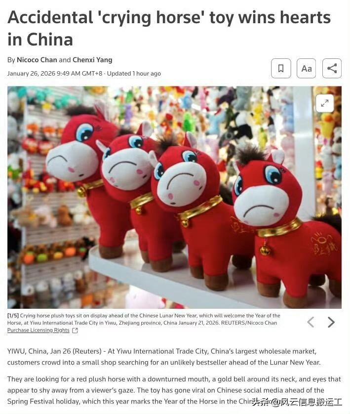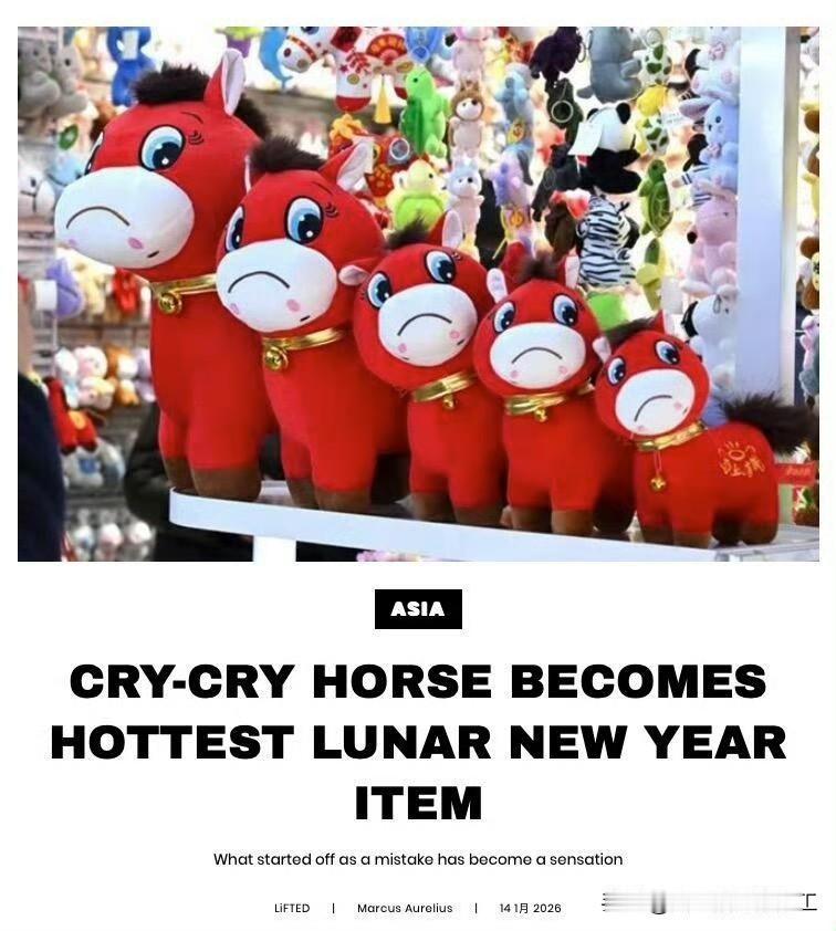 中国“哭哭马”火到海外,联想去年Labubu火遍全球,证明潮玩谷子首要在酷,其次在情感共鸣,最后则需要流量爆点! 相关报道:义乌产的马年玩具,因嘴巴被缝反了方向,从“笑笑马”变“哭哭马”,却意外成了全网追捧的团宠。