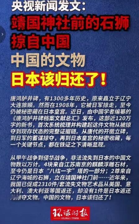 央妈发声了!曾经的八国联军相关国家陆陆续续归还了2310件文物,唯独小日子一件都没还,这般区别对待实在令人愤慨。 熟悉历史的人都知道,日本对中国文物的掠夺,从来都不是战场上随手顺点小玩意的偶然行为,而是有组织、有计划的系统性洗劫。   从甲午战争开始,他们就打着学术研究的幌子,摸清了中国各地的文物分布,到了侵华战争期间,更是变本加厉,搞出所谓的金百合计划,南京大屠杀时,他们的宪兵队不光抢银行、炸库房,连老百姓嘴里的金牙都要敲下来,更别说各地的博物馆、寺院、乡绅宅邸里的珍贵文物了。   据官方统计,从 1931 年到 1945 年,被日本掠夺的中国文物足足有 360 多万件,其中有明确档案可查、整箱登记的就有 1879 箱,这些数字不是随口编造的,都是刻在历史里的铁证。   而这些被抢走的宝贝,如今大多成了日本各大场馆的 “镇馆之宝”,在日本上千座博物馆里,足足藏着近 200 万件中国文物,上到国家级博物馆,下到地方寺院、私人展馆,到处都能看到中国文物的影子。   东京国立博物馆算是藏中国文物最多的地方,馆里 10 万件藏品中,中国文物就占了 1 万件,东洋馆里一半的展厅都留给了中国。   从新石器时代的玉斧玉璧,到商周的青铜重器,再到唐宋的名家书画,南宋的《潇湘卧游图卷》、元代的《禅机图断简寒山拾得图》,都被他们标上日本国宝的标签,锁在馆里严禁游客拍照,京都的泉屋博物馆里,商代的猛虎食人卣被当成稀世珍品展示,有邻馆更是连清宫的琉璃瓦都搬去盖了亭子,连乾隆题写的石碑都随意扔在角落。   更过分的是,日本皇宫里还藏着唐代的鸿胪井碑,这方见证大唐对辽东地区管辖的石碑,1908 年被他们以战利品的名义抢走,藏在皇宫禁区里一百多年,中方多次交涉索要,他们要么推给议会,要么拿天皇当借口,连让学者看一眼都不肯,靖国神社门口的石狮子,还是当年从辽宁海城三学寺抢来的,民间团体讨要多年,也没得到半点实质性回应。   这些文物在日本的场馆里被精心收藏、高调展示,可日本方面却从来不肯正视它们的来路,绝大多数文物的介绍牌上,都刻意抹去了来源信息,少数标注的也只说是私人捐赠,绝口不提掠夺的事实,甚至还打着合法收藏的幌子,拒绝归还的要求。   相比之下,那些八国联军相关国家,即便当初也参与了掠夺,但随着国际社会对文物返还的呼声越来越高,也随着中国综合实力的提升,都陆续拿出了归还的实际行动,哪怕只是部分归还,至少是认了这些文物的归属,可日本却始终揣着掠夺有理的歪心思,连一句诚恳的道歉都不肯说,更别说主动归还文物了。   他们一边借着中国文物办特展、搞研究,标榜中日文化交流,一边却死死攥着抢来的宝贝不肯放手,说到底,还是不愿直面自己的侵华历史,连基本的历史正义都不愿承认,在这样的心态下,自然不会把文物归还提上日程,毕竟在他们眼里,这些靠掠夺得来的文物,早已成了他们不愿割舍的 “文化财富”,却忘了这些宝贝每一件都刻着中国的历史,每一件都是他们侵略行径的铁证。   如今随着中国对海外文物追索的力度不断加大,越来越多的流失宝贝陆续回家,可日本藏着的近 200 万件中国文物,却依旧遥遥无期,不是我们没有追索的决心和能力,而是日本方面的刻意回避和拒不配合,让这场文物回家的路变得格外艰难,而只要日本一天不直面历史,这些散落日本的中国宝贝,就只能继续在异国他乡,等待着回家的那一天。