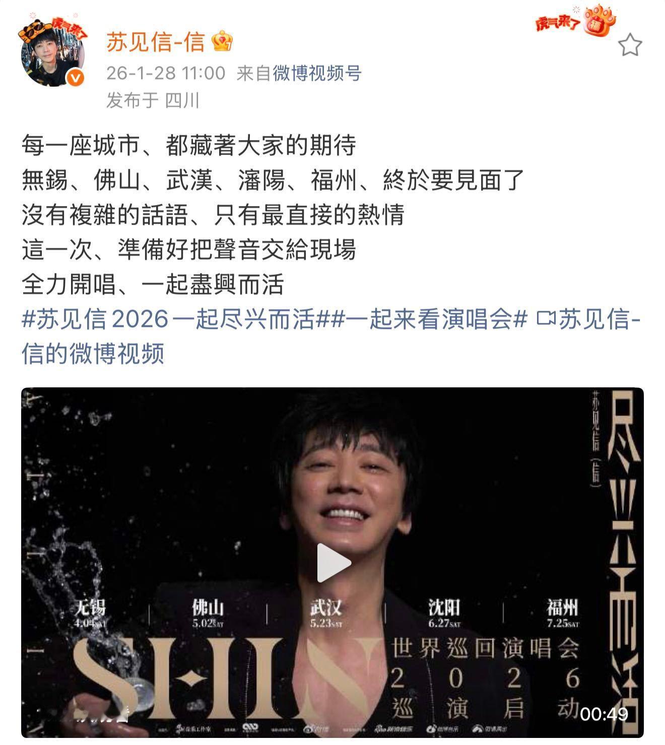 谁教苏见信这么宣传的谁懂啊!这个抒情摇滚主理人苏见信玩起悬念来,也把“尽兴”二字刻进了细节里!这波悬念官宣完全是把粉丝的期待值拉满到顶点🔍 作为自带抒情摇滚buff的尽兴哥,连官宣都要玩出独一份的仪式感💥 九宫格里的“5”不是巧合——日历上圈出的“5”、和广告牌4人同框凑成的5人局,酒店5楼,还有哥看似挥手打招呼实则故意比出的“5”手势,每一处线索都在铺垫大招!评论区的“福尔摩斯”们扒细节各种猜测悬念揭晓——原来是苏见信2026“尽兴而活”巡回演唱会直接官宣五场,4月4日无锡、5月2日佛山、5月23日武汉、6月27日沈阳、7月25日福州,这一把简直给哥宣得尽兴过瘾,给粉丝乐到疯狂上头官宣主打沉浸式埋梗,没人能逃过我们尽兴哥的套路!文案里的“关键信息”,都是写给粉丝的见面邀约时间能不能快进,已经迫不及待看信哥的摇滚现场了